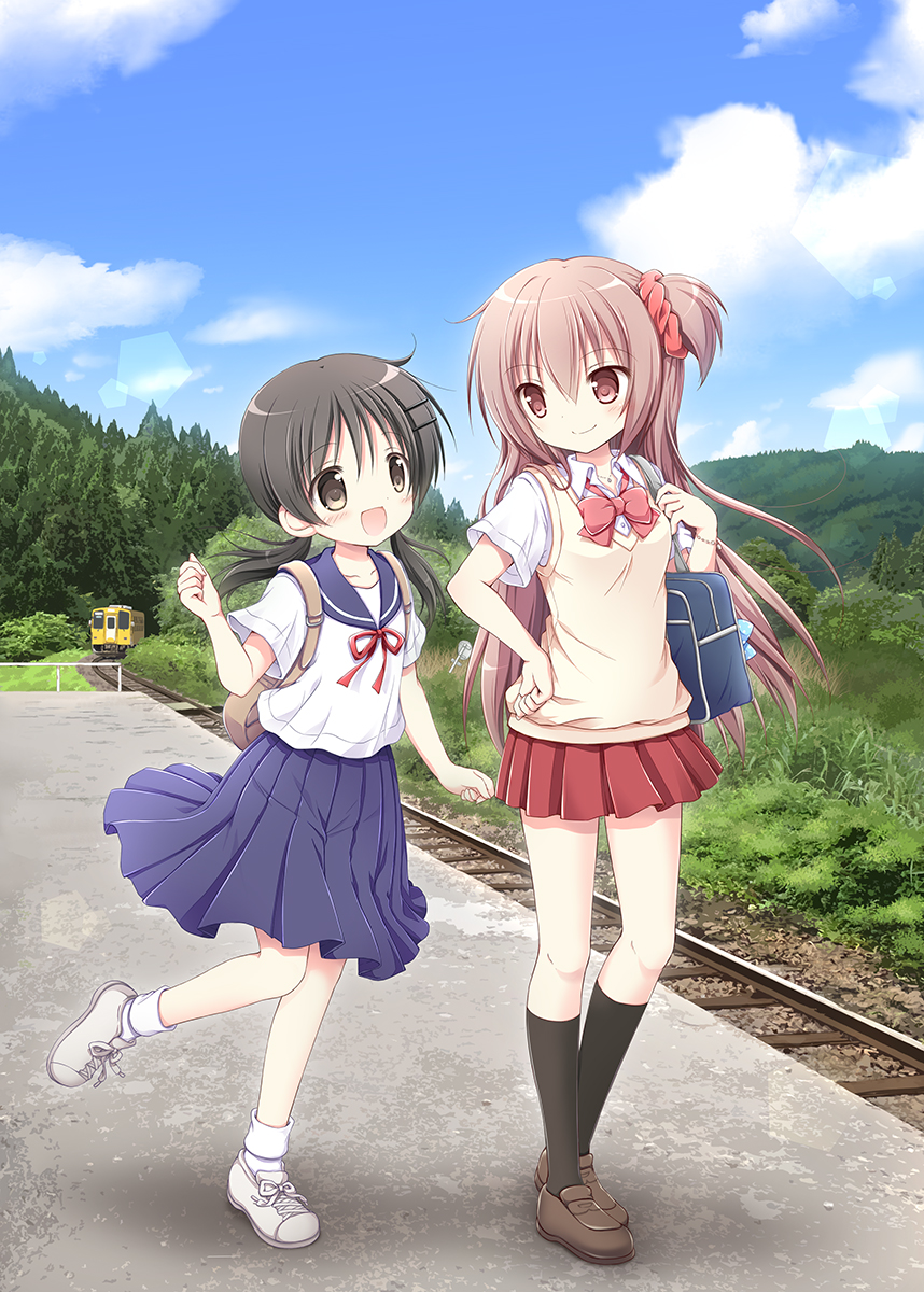 2girls :d bag black_hair black_socks blue_bow blue_skirt blue_sky blush bow bowtie bracelet brown_eyes brown_hair brown_shoes clenched_hand clenched_hands cloud collared_shirt commentary_request day female_focus full_body hair_ornament hair_scrunchie hairclip hand_on_own_hip highres jewelry loafers looking_at_another looking_at_viewer low_twintails multiple_girls multiple_unit_train nanase_miori neck_ribbon one_side_up open_mouth original outdoors pleated_skirt polka_dot polka_dot_bow railroad_tracks red_bow red_bowtie red_eyes red_ribbon red_scrunchie red_skirt ribbon sailor_collar school_bag school_uniform scrunchie serafuku shirt shoes short_hair short_sleeves skirt sky smile socks standing standing_on_one_leg sweater_vest track_ballast train train_station train_station_platform tree twintails vest white_shirt white_shoes white_socks