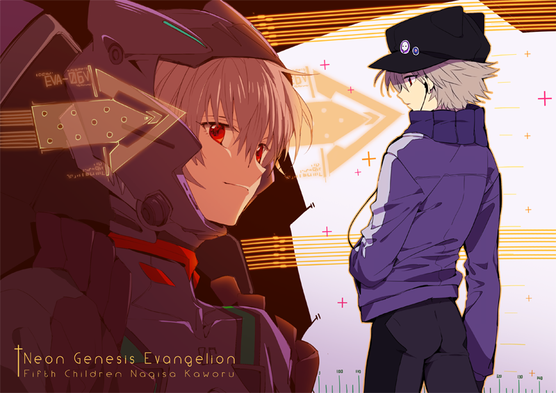 1boy animal_hat bangoul cat_hat commentary_request copyright_name earphones from_behind grey_hair hand_in_pocket hat jacket korean_commentary male_focus mecha_pilot_suit multiple_views nagisa_kaworu neon_genesis_evangelion plugsuit_(evangelion) purple_jacket red_eyes short_hair