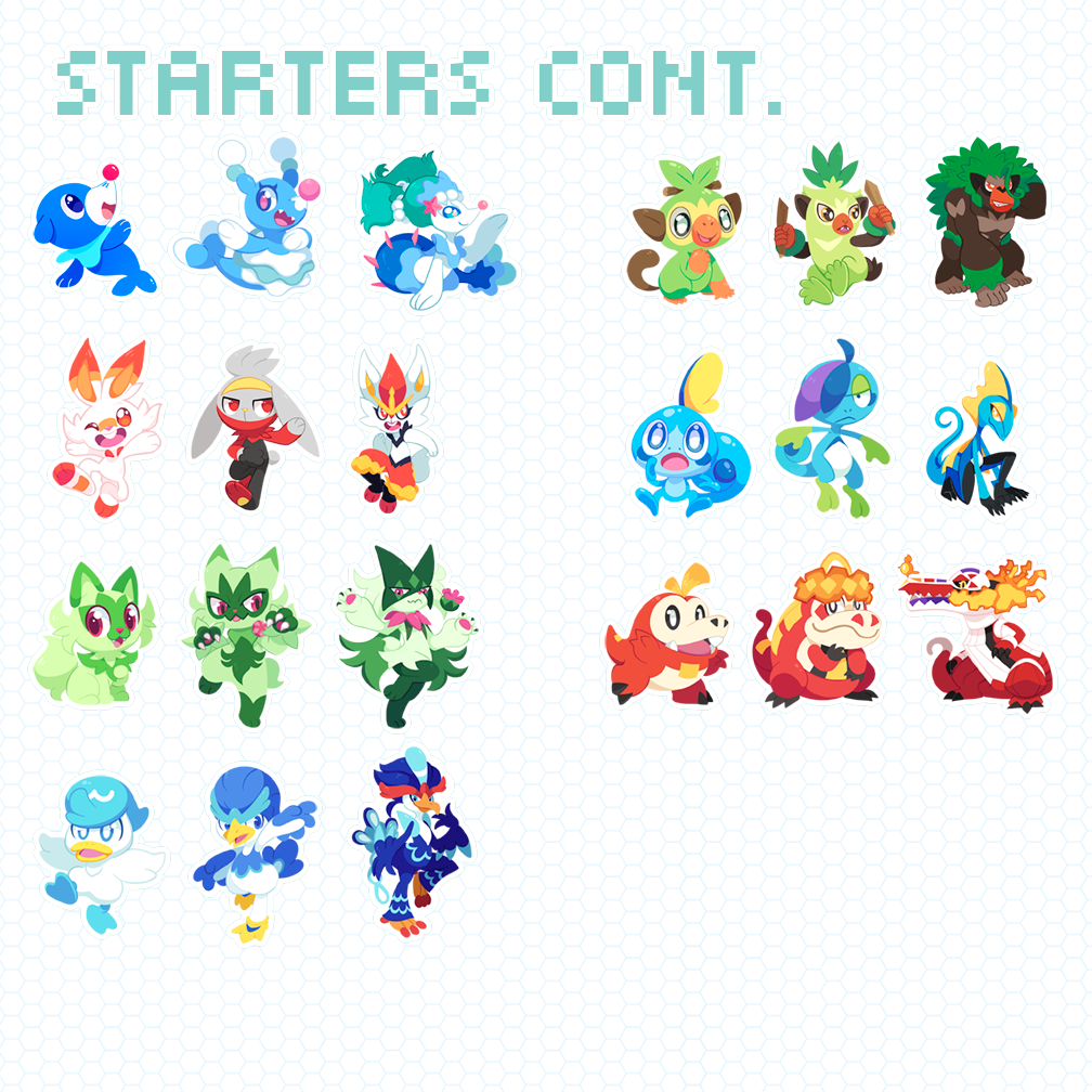 blue_eyes bright_pupils brionne cinderace closed_mouth crocalor drizzile evolutionary_line eyelashes fangs fire fire_bird_(skeledirge) floragato fuecoco full_body gen_7_pokemon gen_8_pokemon gen_9_pokemon grookey holding honeycomb_(pattern) honeycomb_background inteleon meowscarada merchandise_available nintendo no_humans nostrils open_mouth orange_eyes outline pink_eyes pokemon pokemon_(creature) pokemon_focus popplio primarina quaquaval quaxly quaxwell raboot rillaboom scorbunny sharmieart skeledirge smile sobble sprigatito thwackey white_outline white_pupils yellow_eyes