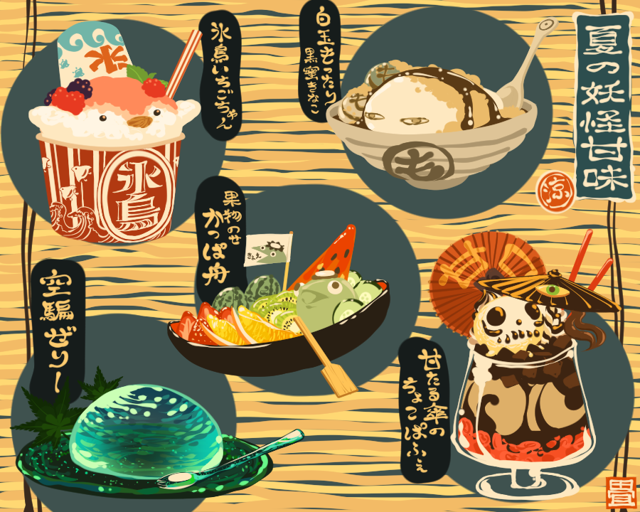 bird chocolate cocktail_umbrella commentary_request cup dessert drinking_glass drinking_straw food food_focus fruit kappa kiwi_(fruit) kiwi_slice no_humans orange_(fruit) orange_slice original penguin raspberry spoon strawberry strawberry_slice tatami111