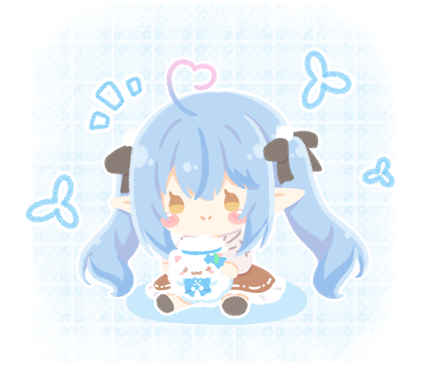 1girl ahoge black_bow black_shoes blue_background blue_hair blush_stickers bow brown_eyes brown_skirt chibi closed_mouth colored_shadow commentary_request gradient_hair grey_shirt grid_background hair_between_eyes hair_bow heart heart_ahoge highres hololive long_hair long_sleeves mitarashi_neko multicolored_hair pink_hair pointy_ears polka_dot polka_dot_background puffy_long_sleeves puffy_sleeves shadow shirt shoes sitting skirt smile streaked_hair twintails very_long_hair virtual_youtuber yukihana_lamy yukihana_lamy_(casual) yukimin_(yukihana_lamy)
