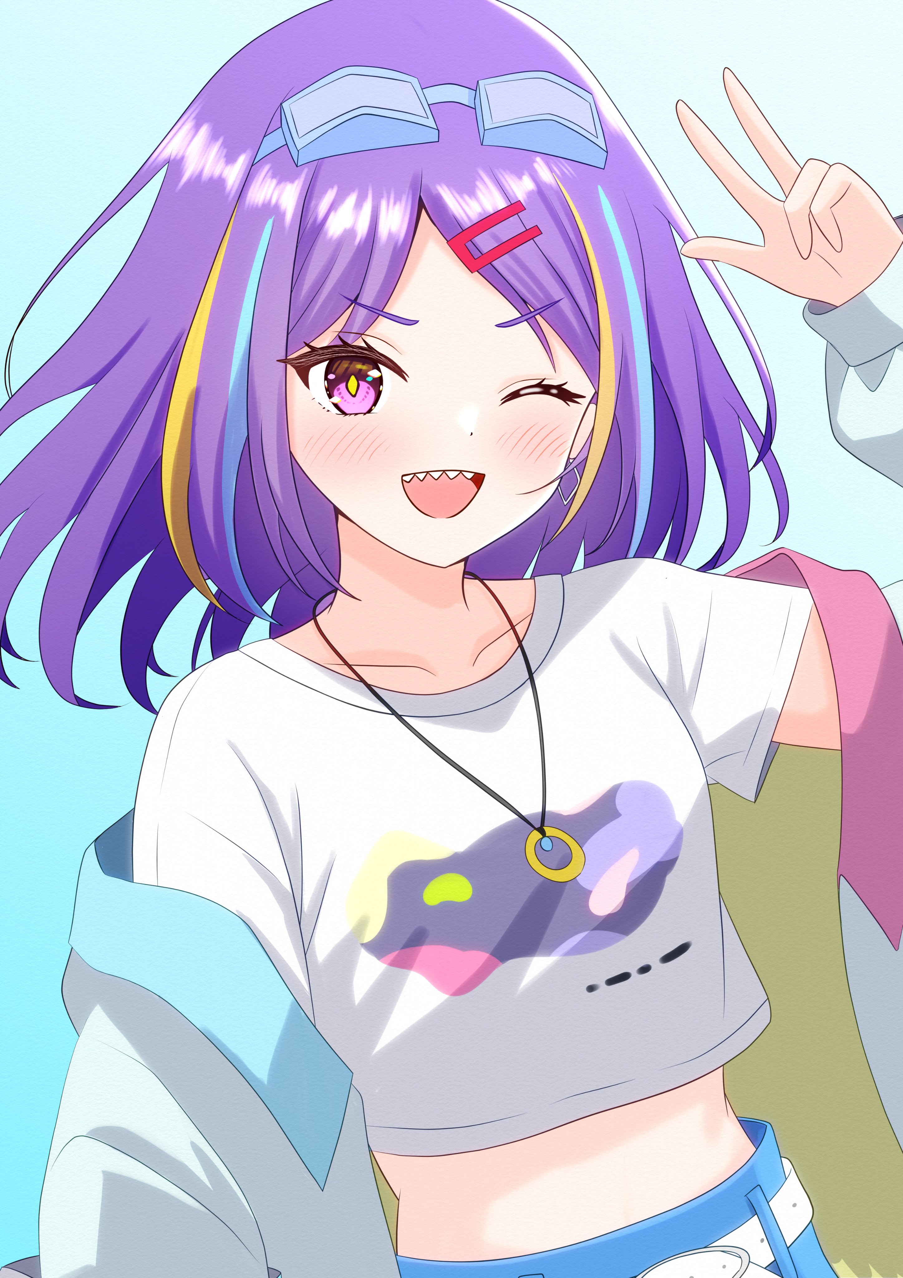 1girl ;d absurdres blush coat commentary_request earrings eyelashes eyewear_on_head goggles goggles_on_head hair_down hand_up happy heaven_burns_red highres ishii_iroha ishii_iroha_(sensory_overload) jewelry looking_at_viewer luck_hebuban medium_hair midriff multicolored_hair necklace official_alternate_costume official_alternate_hairstyle one_eye_closed open_mouth parted_bangs purple_eyes purple_hair sharp_teeth shirt short_sleeves smile solo streaked_hair t-shirt teeth upper_teeth_only v v-shaped_eyebrows white_coat white_shirt yellow_pupils