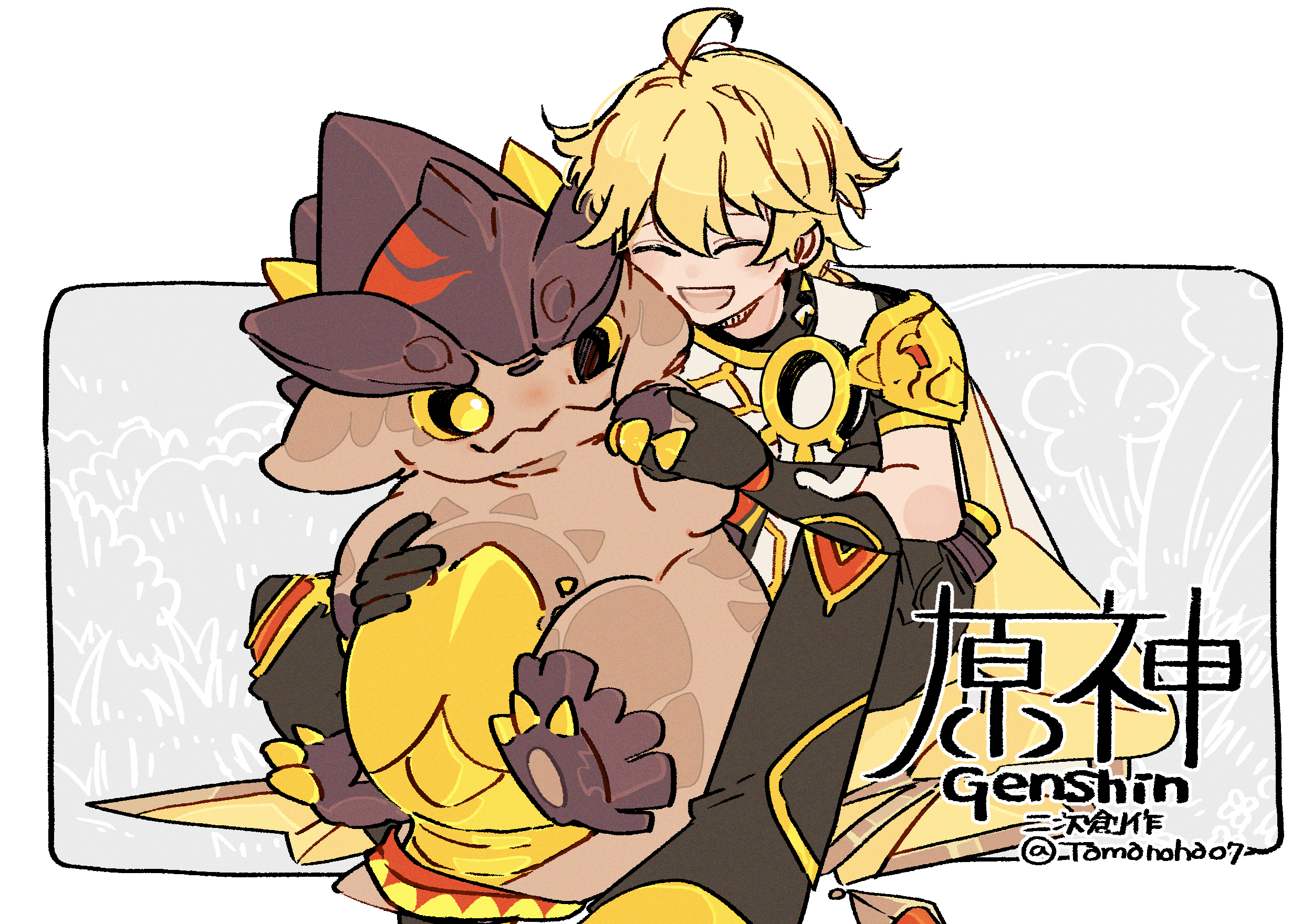 1boy :3 aether_(genshin_impact) ahoge artist_name black_gloves blonde_hair cape closed_eyes commentary_request elbow_gloves full_body genshin_impact gloves highres holding_hands little_one_(genshin_impact) male_focus open_mouth short_hair short_sleeves simple_background sitting smile surprised tamanoha_(cookware) tepetlisaurus_(genshin_impact) watermark white_background yellow_cape yellow_eyes