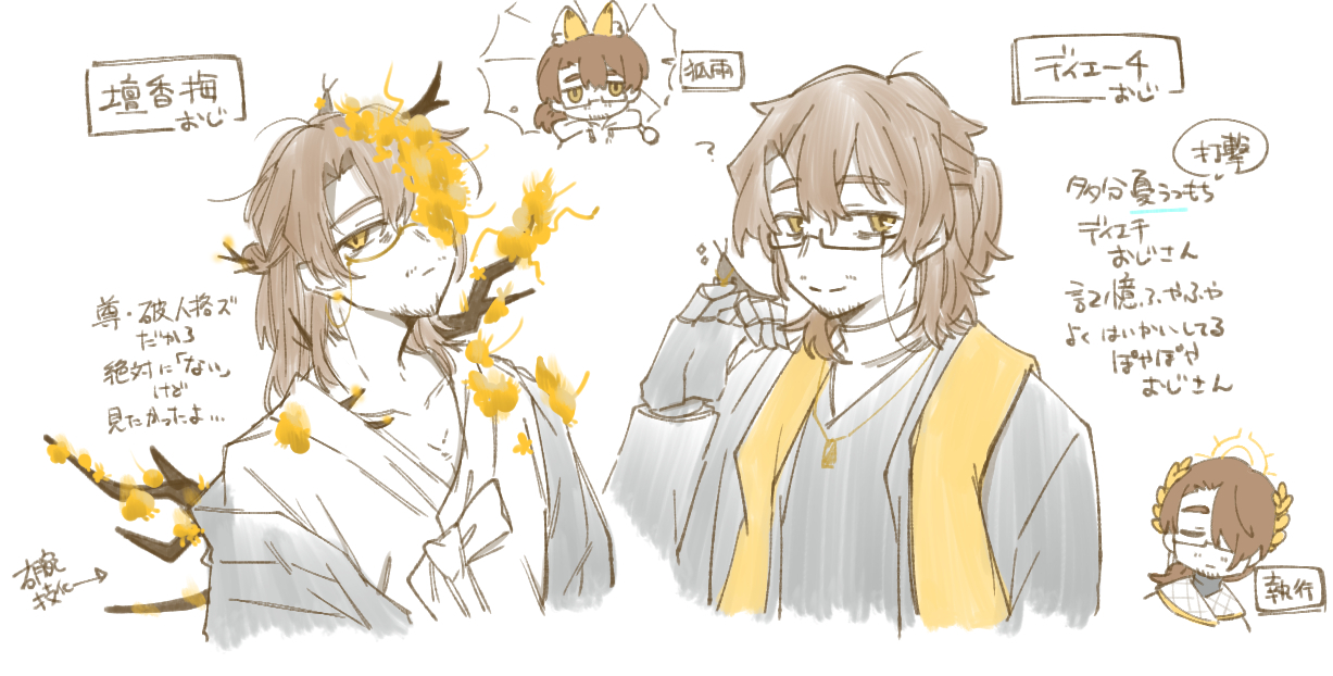 1boy ? absurdres alternate_costume amputee animal_ears arrow_(symbol) bags_under_eyes beard_stubble black-framed_eyewear black-framed_glasses black_coat black_sweater branch brown_hair chibi chibi_inset closed_eyes closed_mouth coat collarbone crown dieci_association_south_uniform drifting_fox e.g.o_(project_moon) expressionless facial_hair flower formal_clothes fox_boy fox_ears from_side glasses gloves gold_trim gregor_(project_moon) hair_between_eyes hair_intakes hair_ornament hair_over_one_eye half-closed_eyes half_updo hand_up head_tilt high_collar high_ponytail highres holding holding_umbrella japanese_clothes jewelry jitome joints kemonomimi_mode laurel_crown laurels lily26983455 limbus_company long_hair long_sleeves looking_at_viewer low_ponytail male_focus mechanical_arms multiple_views necklace no_mouth one_eye_covered parted_bangs partially_colored pectoral_cleavage pectorals petals plant plant_roots ponytail project_moon prosthesis prosthetic_arm pursuance_(e.g.o) quilted_clothes raincoat rectangular_eyewear robe sanpaku scarf semi-rimless_eyewear shirt simple_background single_mechanical_arm smile solo speech_bubble spicebush_(e.g.o) stole stubble sunshower_(e.g.o) sweater torn_umbrella translation_request tree turtleneck turtleneck_shirt turtleneck_sweater umbrella under-rim_eyewear upper_body variations white_background white_coat white_robe yellow_eyes yellow_flower yellow_petals yellow_scarf yellow_stole