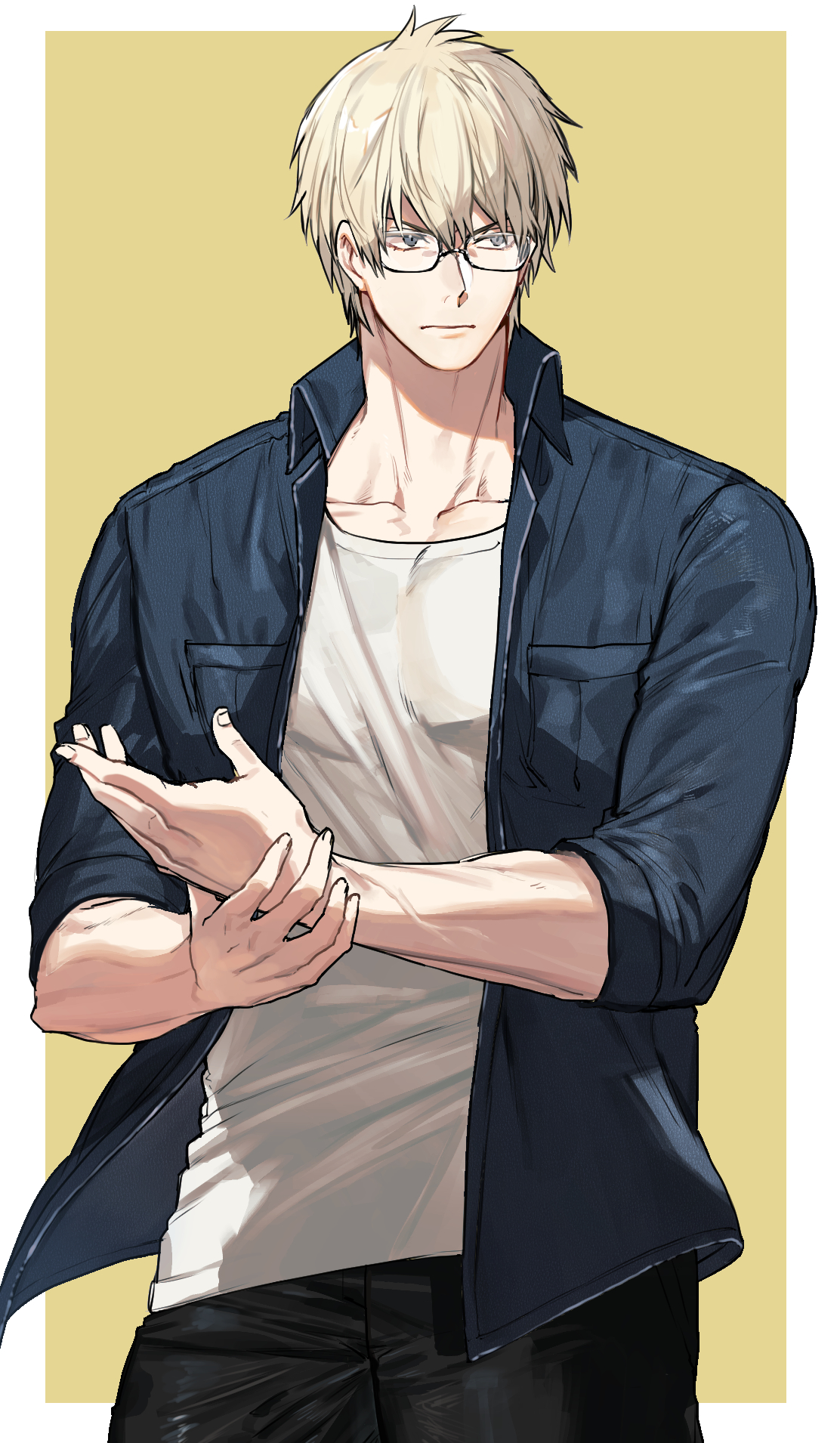 1boy blonde_hair blue_eyes collared_shirt commentary_request covered_pectorals denim glasses gunji_(jinrui_kyuusai_game) highres jeans jinrui_kyuusai_game male_focus manly muscular open_clothes open_shirt pants pectorals shirt short_hair sleeves_rolled_up tank_top tsunamune_touka upper_body veins veiny_arms yellow_background