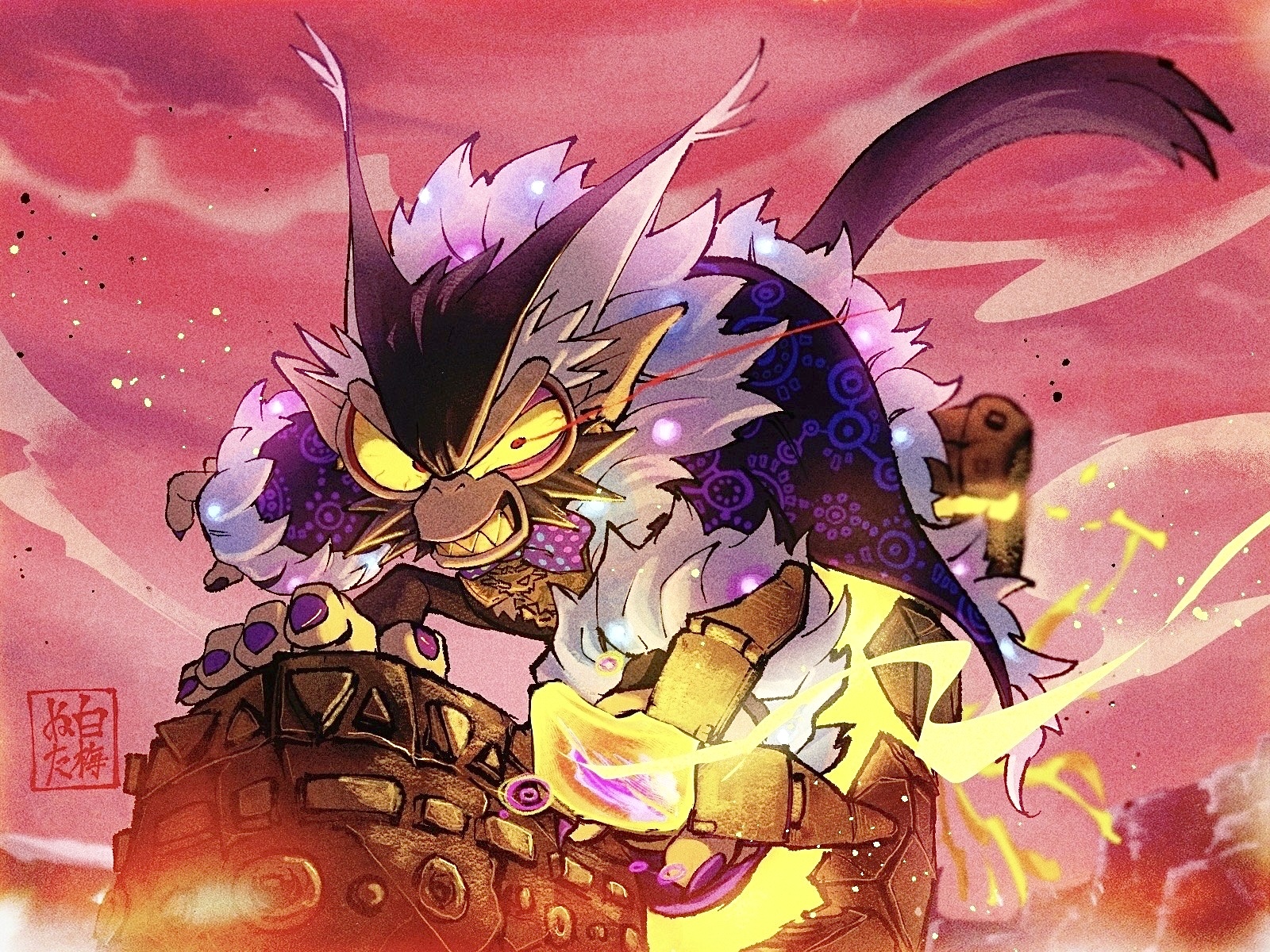 1boy angry coat colored_teeth commentary_request donkey_kong_(series) donkey_kong_bananza eye_trail full_body gold_teeth highres kurotake_ihi light_trail male_focus monkey_boy nintendo pointy_ears purple_coat purple_nails red_eyes red_sky signature sky solo void_kong yellow_teeth