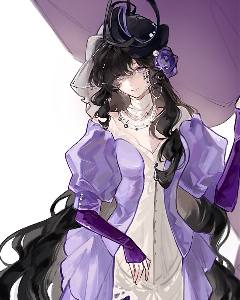 1girl bare_shoulders black_flower black_hair black_hat black_rose cropped curtain_grab curtains dress evening_gown flower hair_flower hair_ornament hand_up hat isolde_(reverse:1999) jiao_zhuren_gei_ni_gougou_binggan_chi juliet_sleeves long_hair long_sleeves puffy_sleeves purple_dress purple_eyes purple_flower purple_rose reverse:1999 rose see-through_clothes see-through_veil solo upper_body veil very_long_hair white_background