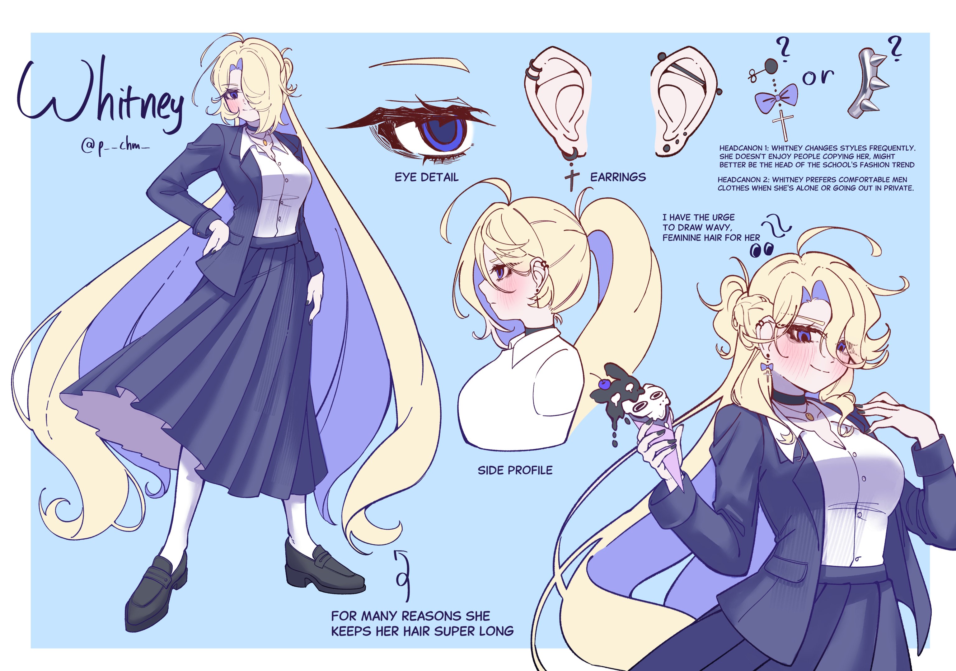arrow_(symbol) barbell_piercing black_shoes blonde_hair blue_eyes blush bow bow_earrings breasts character_profile choker cleavage collared_shirt commentary croquette cross cross_earrings degrees_of_lewdity ear_piercing earclip earrings english_commentary english_text hair_over_one_eye hand_on_own_hip highres industrial_piercing jacket jewelry mary_janes multiple_earrings necklace p_chm piercing shirt shoes skirt whitney_(degrees_of_lewdity) whitney_(female)_(degrees_of_lewdity)