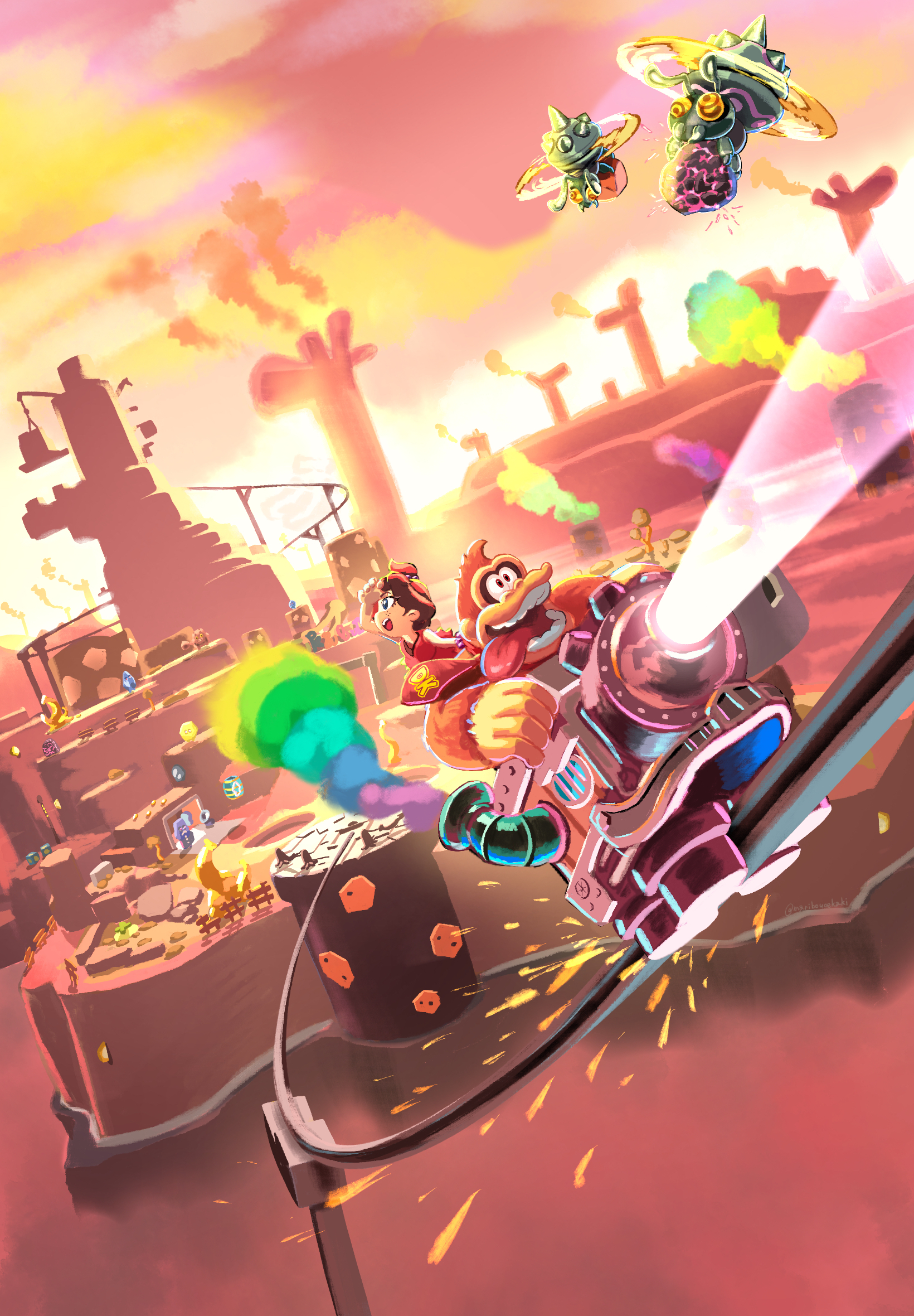 1boy 1girl ape commentary_request donkey_kong donkey_kong_(series) donkey_kong_bananza dress embers fractone_(donkey_kong) freckles furry furry_male headlight_beam highres looking_afar maribou_(supermaribou) mario_(series) minecart necktie nintendo open_mouth pauline_(nintendo) pauline_(young)_(nintendo) red_dress red_necktie tongue tongue_out