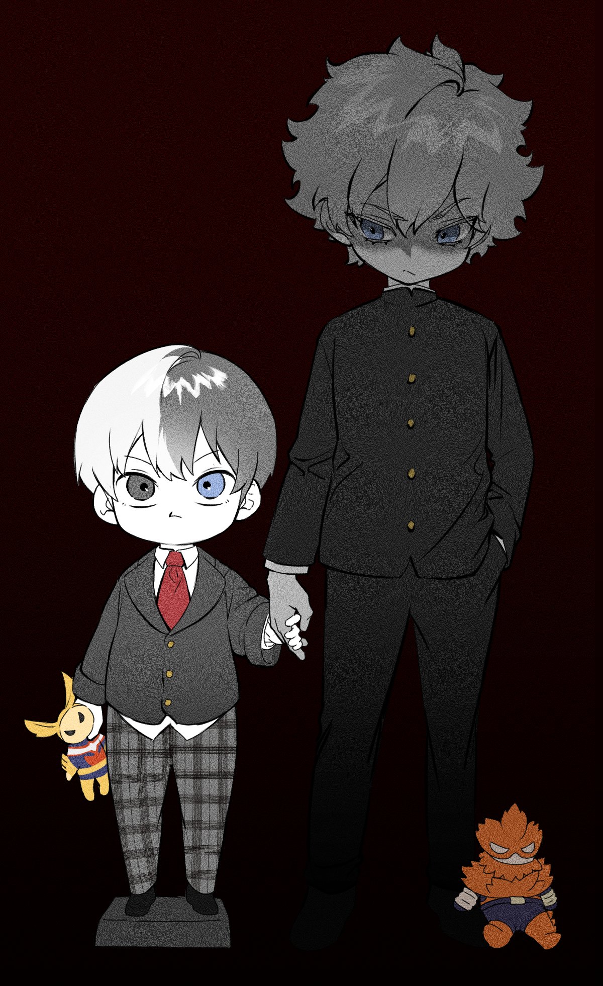 2boys all_might bkg0303 black_jacket black_pants black_shoes blue_eyes boku_no_hero_academia bow brothers child collared_shirt commentary_request endeavor_(boku_no_hero_academia) frown furrowed_brow gakuran gold_buttons grey_eyes grey_hair hair_between_eyes hand_in_pocket heterochromia highres holding holding_hands holding_toy jacket korean_commentary male_focus multicolored_hair multiple_boys necktie pants red_background red_necktie school_uniform shirt shoes short_hair siblings suit_jacket todoroki_shoto todoroki_touya toy two-tone_hair unfinished white_hair white_shirt