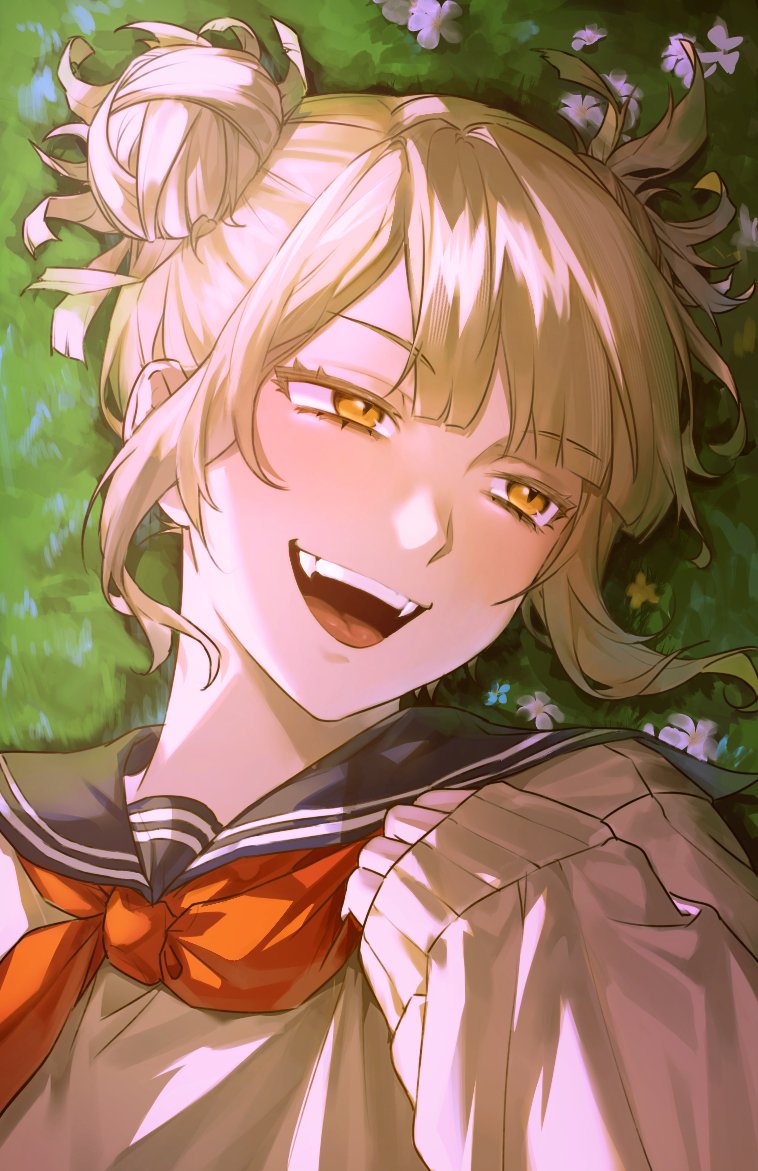 1girl bkg0303 black_sailor_collar blonde_hair blunt_bangs boku_no_hero_academia commentary_request double_bun fangs flower grass hair_bun hand_on_own_chest korean_commentary messy_hair neckerchief open_mouth pink_flower red_neckerchief sailor_collar school_uniform sidelocks sleeves_past_wrists slit_pupils smile solo sweater toga_himiko updo upper_body yellow_eyes