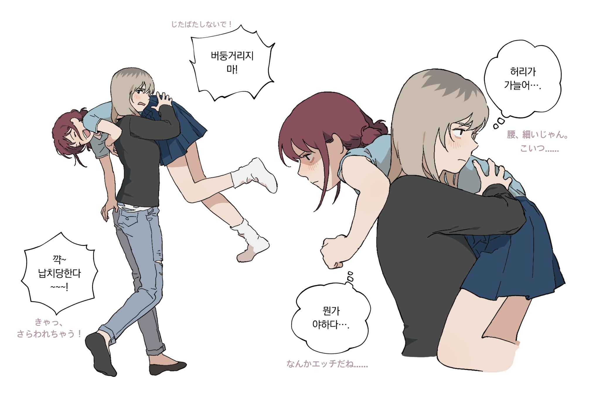 2girls black_shirt black_socks blue_shirt blue_skirt blush carrying carrying_over_shoulder closed_mouth commentary denim girls_band_cry grey_hair grey_pants highres iseri_nina jeans kawaragi_momoka korean_text krisjennnnn long_hair multicolored_hair multiple_girls pants pleated_skirt roots_(hair) shirt simple_background skirt socks speech_bubble thought_bubble translation_request white_background white_socks