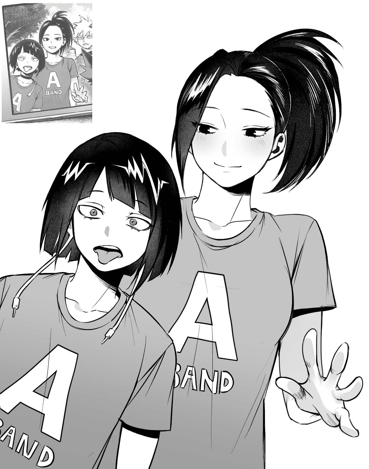 2girls bkg0303 black_hair boku_no_hero_academia breasts closed_mouth commentary_request diagonal_bangs earphones greyscale highres jiro_kyoka korean_commentary light_blush long_hair medium_breasts monochrome multiple_girls open_mouth ponytail print_shirt reference_inset shirt short_hair smile t-shirt tongue tongue_out upper_body white_background yaoyorozu_momo