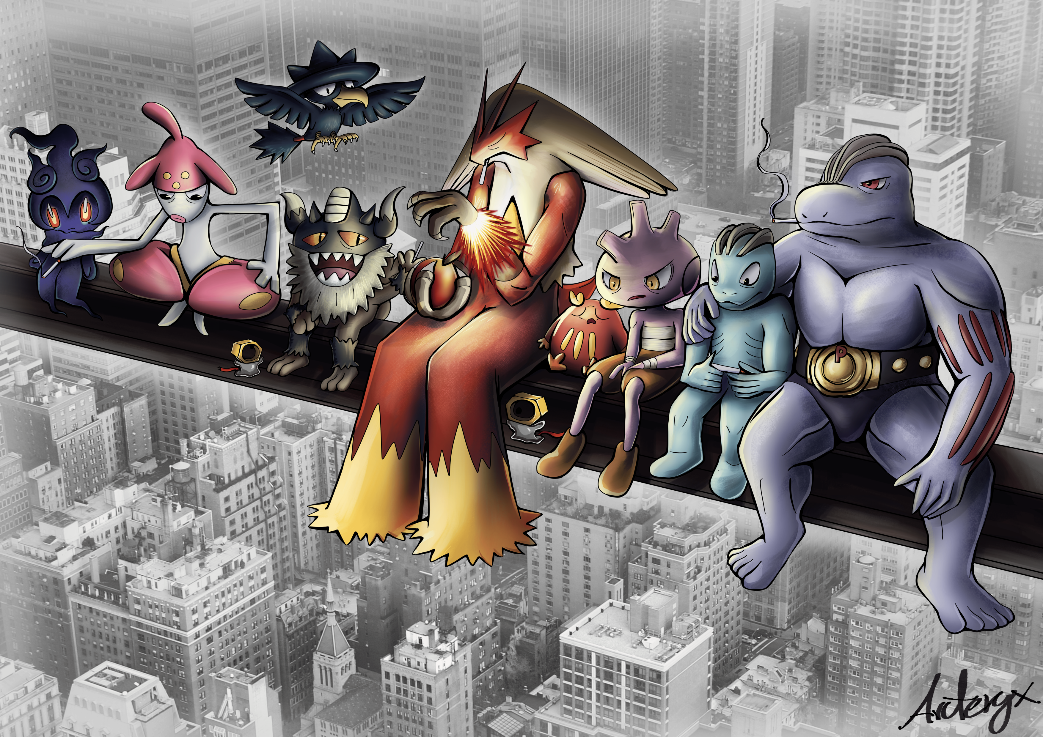 absurdres archecopeteryx belt building cigarette city claws closed_eyes closed_mouth commentary darumaka english_commentary fire flying food fruit gen_1_pokemon gen_2_pokemon gen_3_pokemon gen_5_pokemon gen_7_pokemon gen_8_pokemon hand_on_another's_shoulder highres holding holding_cigarette holding_food holding_fruit horns legendary_pokemon lunch_atop_a_skyscraper_(photograph) machoke machop marshadow medicham meltan murkrow muscular mythical_pokemon nintendo nut_(hardware) open_mouth parody perrserker photo_background pokemon pokemon_(creature) pokemon_focus red_eyes sharp_teeth signature sitting skyscraper smile smoke steel_beam teeth tyrogue yellow_eyes