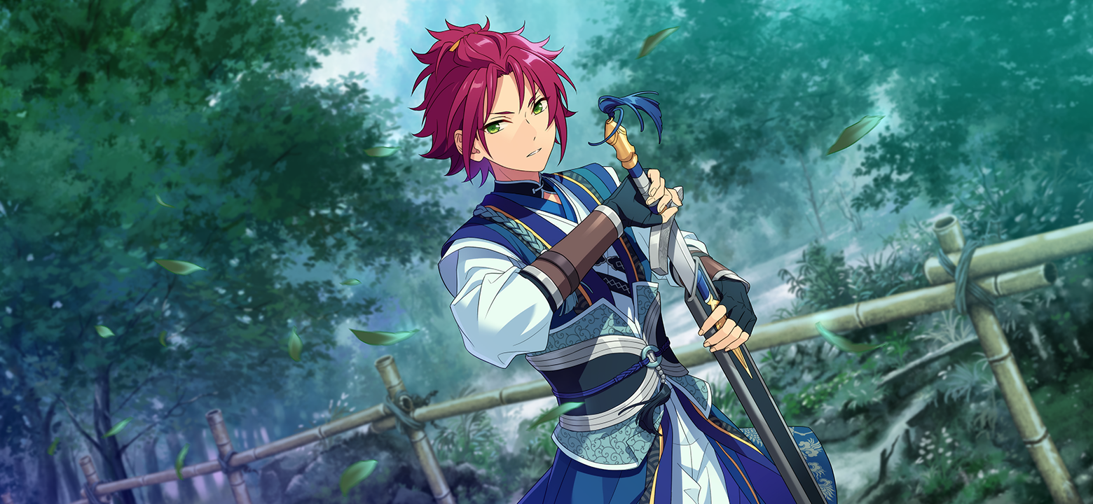 1boy bamboo bangs_pinned_back clenched_teeth clothing_request curtained_hair ensemble_stars! fingerless_gloves fingernails game_cg gloves green_eyes hair_ornament hairclip hands_up happy_elements holding holding_sheath holding_sword holding_weapon ikkitousen_(ensemble_stars!) isara_mao leaf long_sleeves looking_at_viewer male_focus mandarin_collar official_art outdoors parted_lips red_hair scabbard sheath short_hair solo sword teeth third-party_source tree weapon