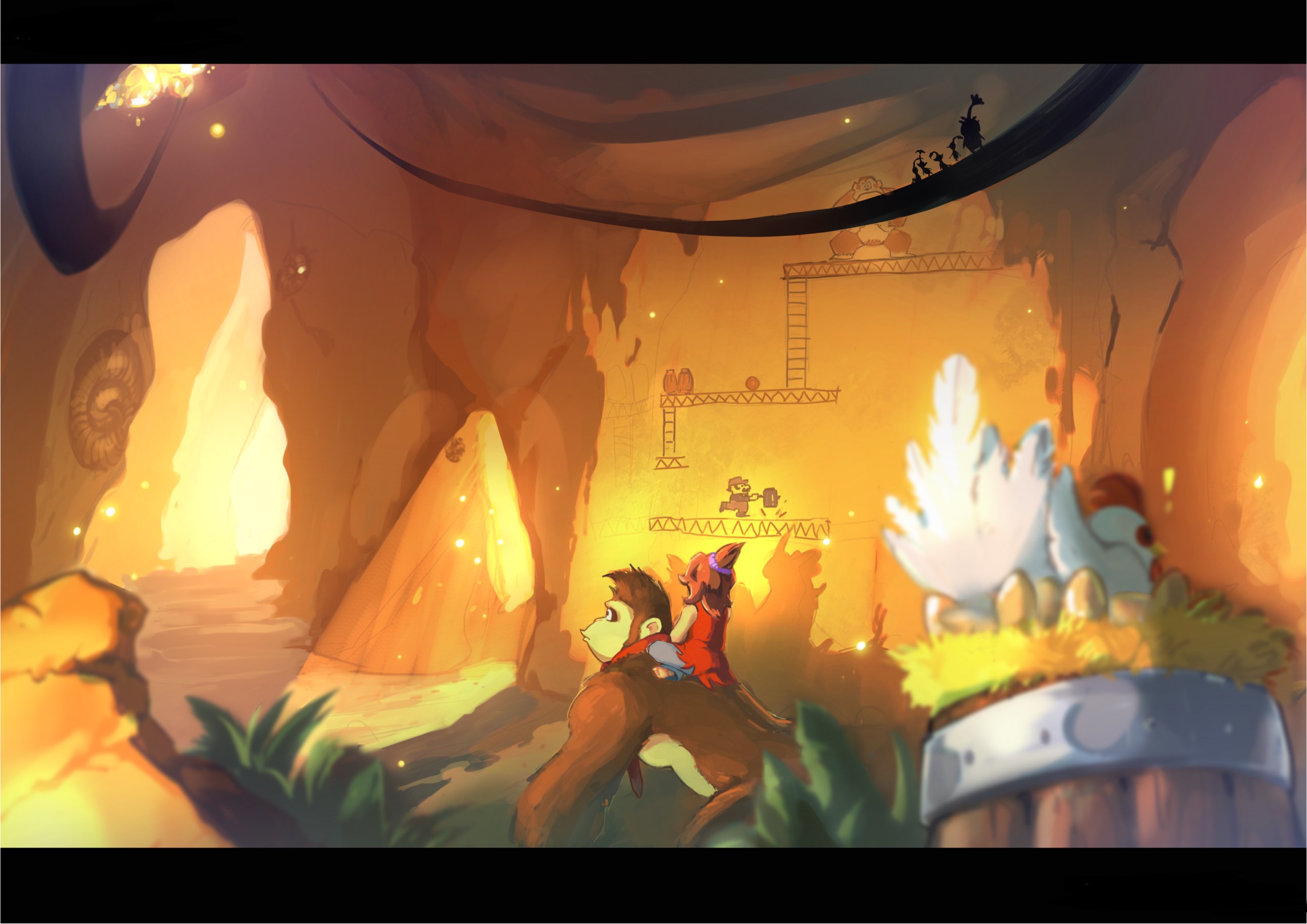 1boy 1girl ape barrel bird brown_hair chicken closed_mouth commentary_request denim donkey_kong donkey_kong_(1981_game) donkey_kong_(series) donkey_kong_bananza furry furry_male highres jeans letterboxed mario mario_(series) necktie nintendo orenji_(ydtd2453) pants pauline_(nintendo) pauline_(young)_(nintendo) pikmin_(creature) pikmin_(series) red_necktie red_shirt riding shirt short_hair