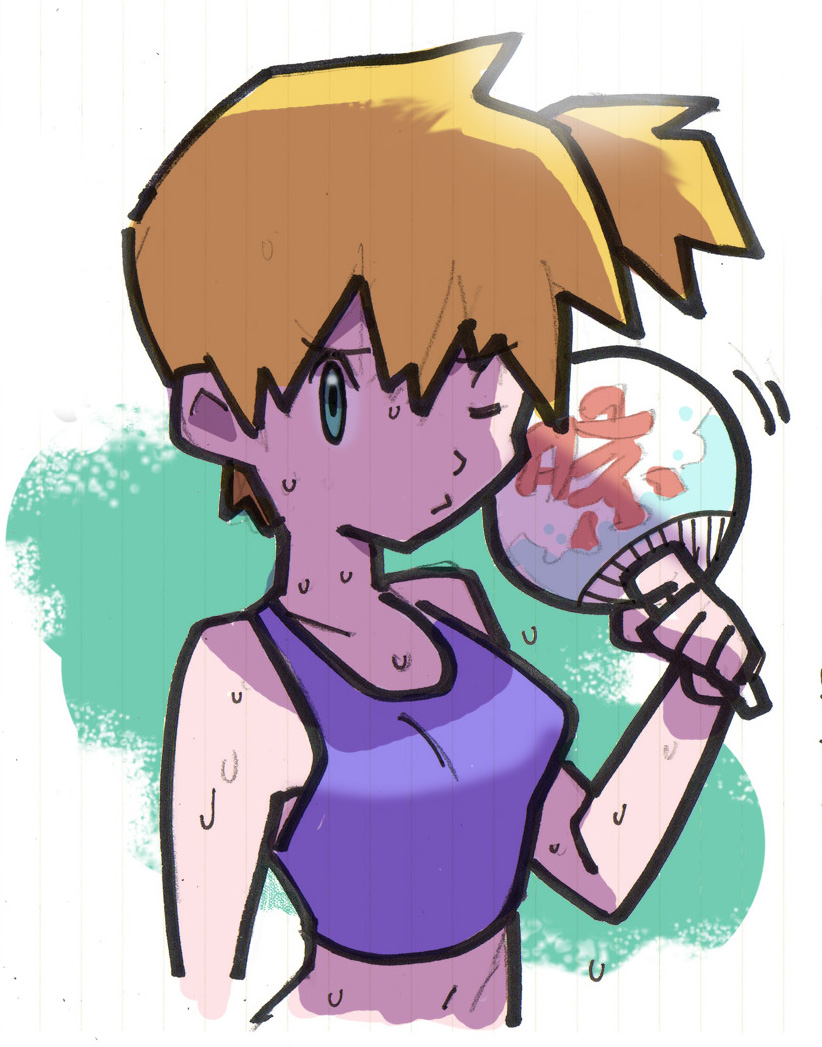 1girl asymmetrical_hair blue_shirt blue_tank_top bravefarm2 breasts closed_mouth crop_top green_eyes hair_between_eyes hand_fan hand_up holding holding_fan hot looking_at_viewer midriff misty_(pokemon) navel nintendo one_eye_closed orange_hair paper_fan pokemon pokemon_firered_and_leafgreen ponytail purple_shirt shirt short_hair side_ponytail solo sweat tank_top uchiwa upper_body