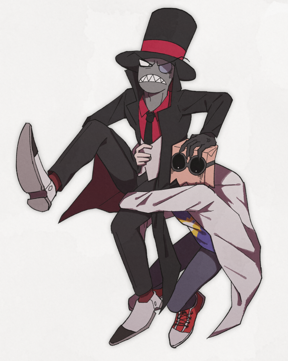 2boys black_coat black_hat black_hat_(villainous) black_pants blue_shirt clenched_teeth coat colored_skin dr._flug full_body goggles grey_skin hat highres hug lab_coat leg_up male_focus monocle multiple_boys netekun pants red_shirt red_shoes sharp_teeth shirt shoes simple_background teeth top_hat villainous white_background white_shoes
