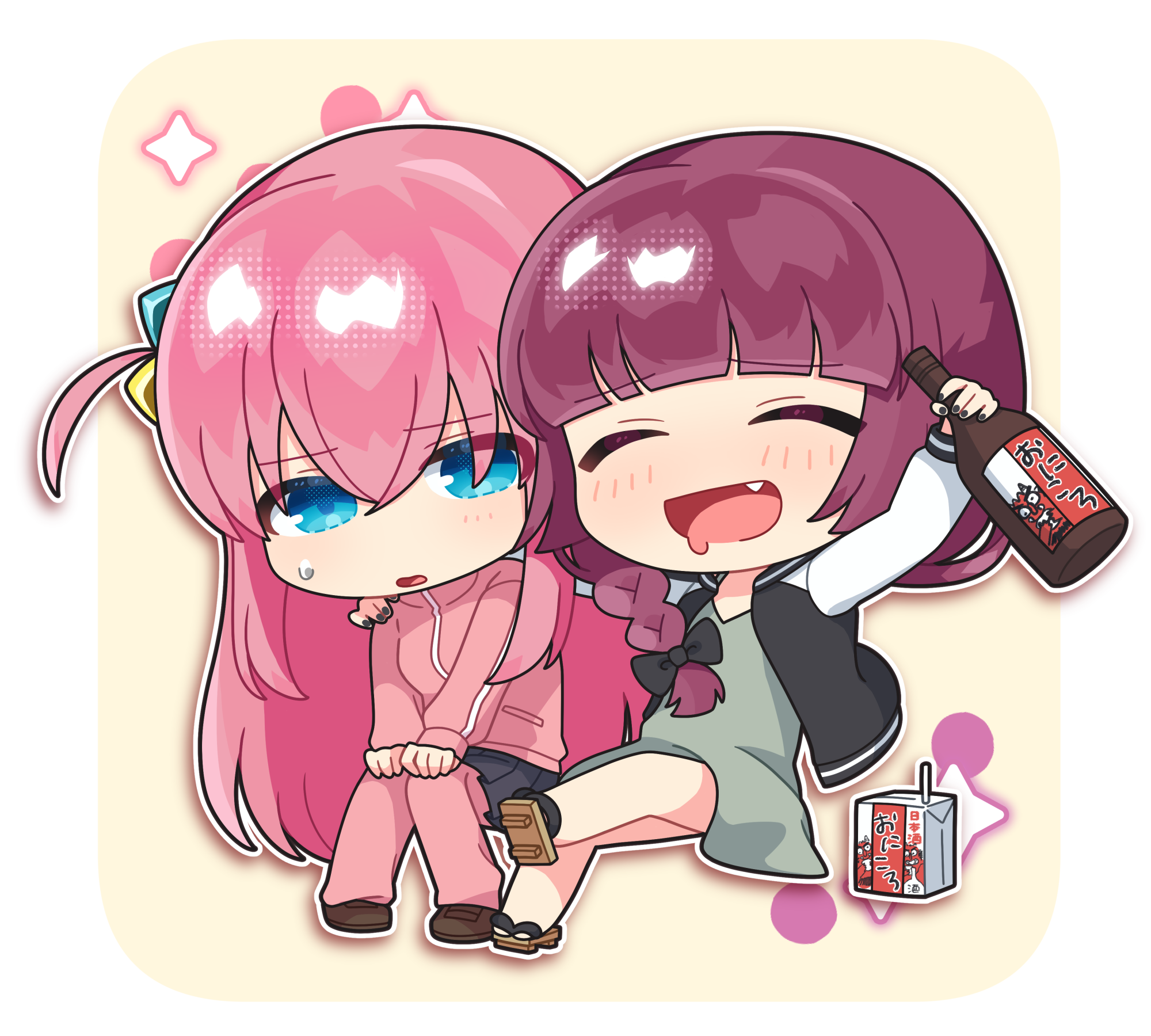2girls arm_up black_jacket black_skirt bocchi_the_rock! bottle braid breasts chibi chibi_only closed_eyes commentary_request dress geta gotoh_hitori green_dress hand_on_another's_shoulder highres hiroi_kikuri holding holding_bottle jacket multicolored_jacket multiple_girls natori_nato open_mouth parted_lips pink_hair pink_jacket purple_hair sitting skirt smile sweatdrop two-tone_jacket white_jacket