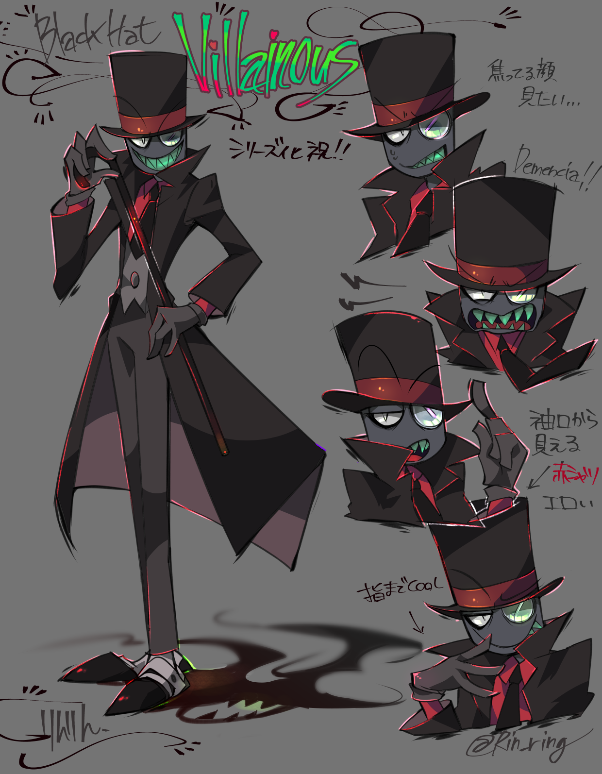 1boy apple_picco black_coat black_hat black_hat_(villainous) black_necktie black_shoes character_name clenched_teeth coat collared_shirt colored_skin copyright_name full_body gloves grey_background grey_gloves grey_pants grey_skin hand_up hat highres looking_at_viewer male_focus monocle multiple_views necktie open_clothes open_coat open_mouth pants red_shirt shadow sharp_teeth shirt shoes smile standing teeth tongue top_hat translation_request upper_body villainous