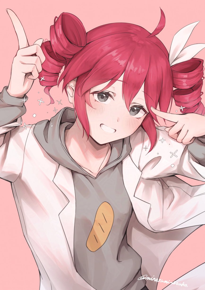 1girl baguette blush braid bread commentary_request double-parted_bangs drill_hair food food_print grey_eyes grey_hoodie grin highres hood hoodie index_fingers_raised kasane_teto lab_coat looking_at_viewer minazumi_souka pink_background pointing pointing_at_self print_hoodie red_eyes red_hair ribbon side_braid smile solo synthesizer_v twin_drills twintails twitter_username upper_body white_ribbon