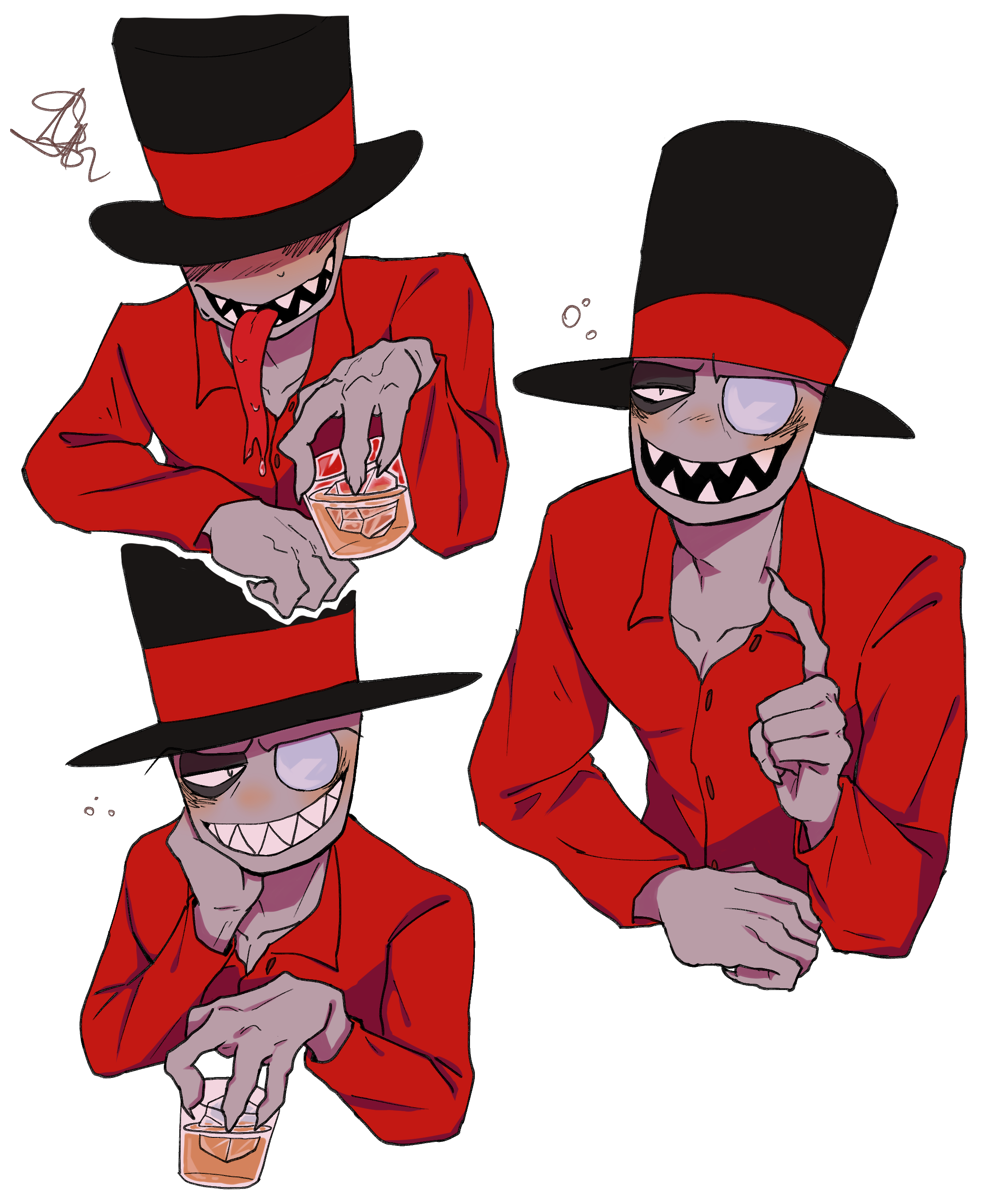 1boy absurdres black_hat black_hat_(villainous) buttons collarbone collared_shirt cropped_torso cup drink drunk grin hand_up hat head_rest highres holding holding_cup male_focus multiple_views netekun no_coat open_mouth red_shirt shirt signature simple_background smile tongue tongue_out top_hat upper_body villainous white_background