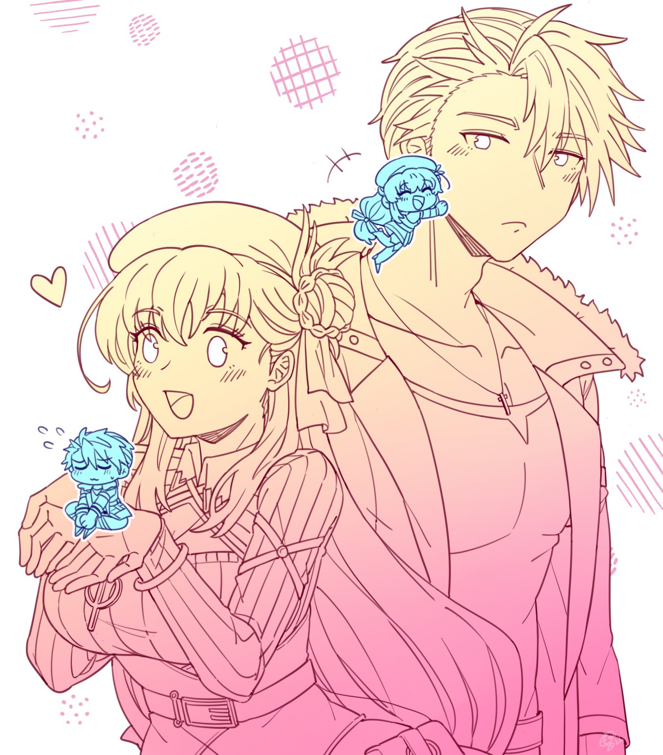 1boy 1girl :d agnes_claudel beret blush braid breasts bun_with_braided_base chibi closed_mouth commentary eiyuu_densetsu embarrassed english_commentary fur-trimmed_collar fur_trim hair_between_eyes hair_bun hair_ribbon hair_slicked_back hat heart highres jacket jewelry kai_no_kiseki kuro_no_kiseki_(series) large_breasts limited_palette long_hair misa_fullmetal necklace open_mouth parted_bangs pendant ribbed_sweater ribbon short_hair simple_background single_side_bun smile sweater upper_body van_arkride white_background