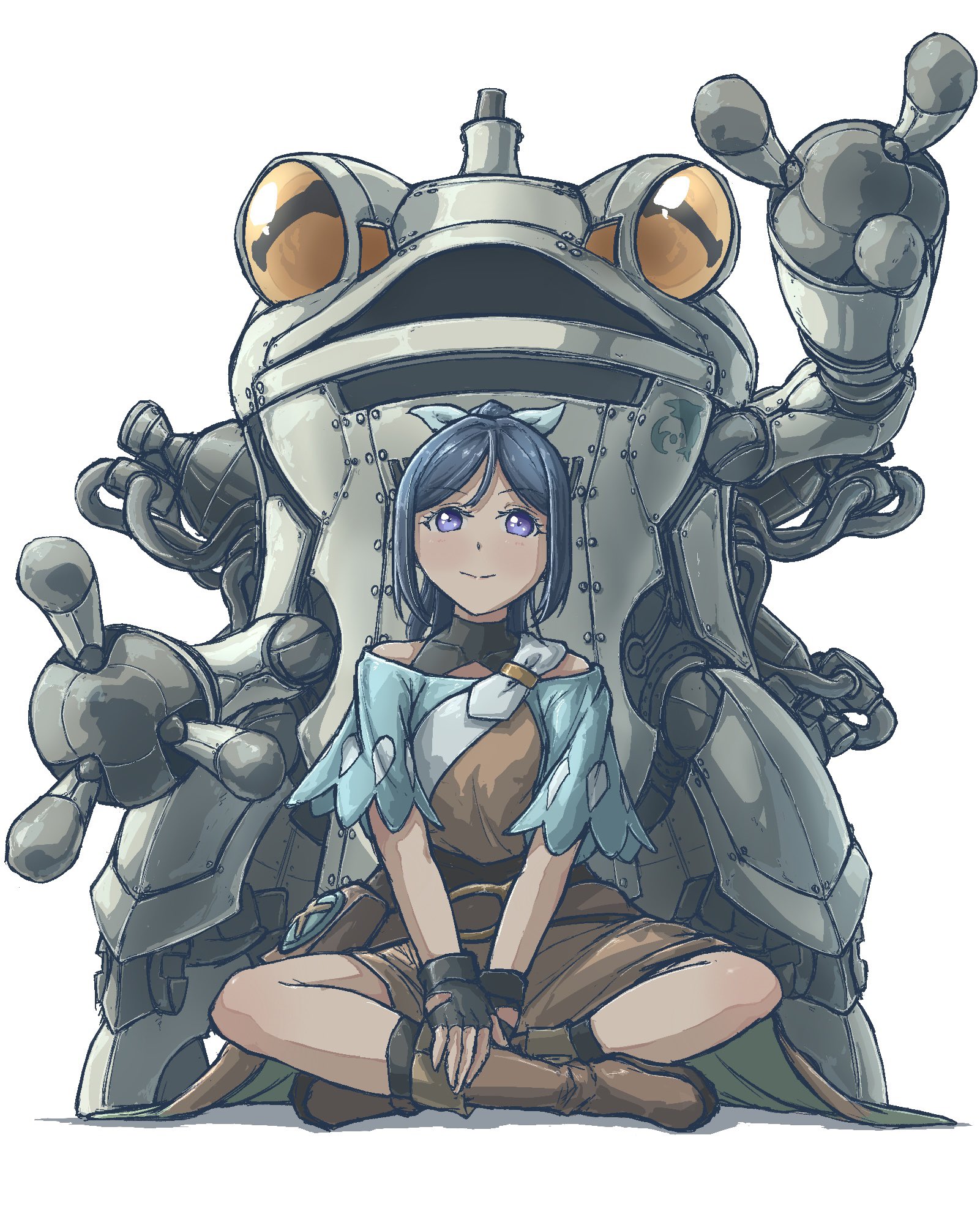 1girl black_gloves blue_hair blue_shirt boots brown_boots brown_dress closed_mouth commentary dress fingerless_gloves genjitsu_no_yohane gloves hancho_1021 high_ponytail highres indian_style kanan_(genjitsu_no_yohane) looking_at_viewer love_live! love_live!_sunshine!! matsuura_kanan non-humanoid_robot off-shoulder_shirt off_shoulder open_mouth ponytail purple_eyes robot robot_animal shirt simple_background sitting tonosama_(genjitsu_no_yohane) white_background