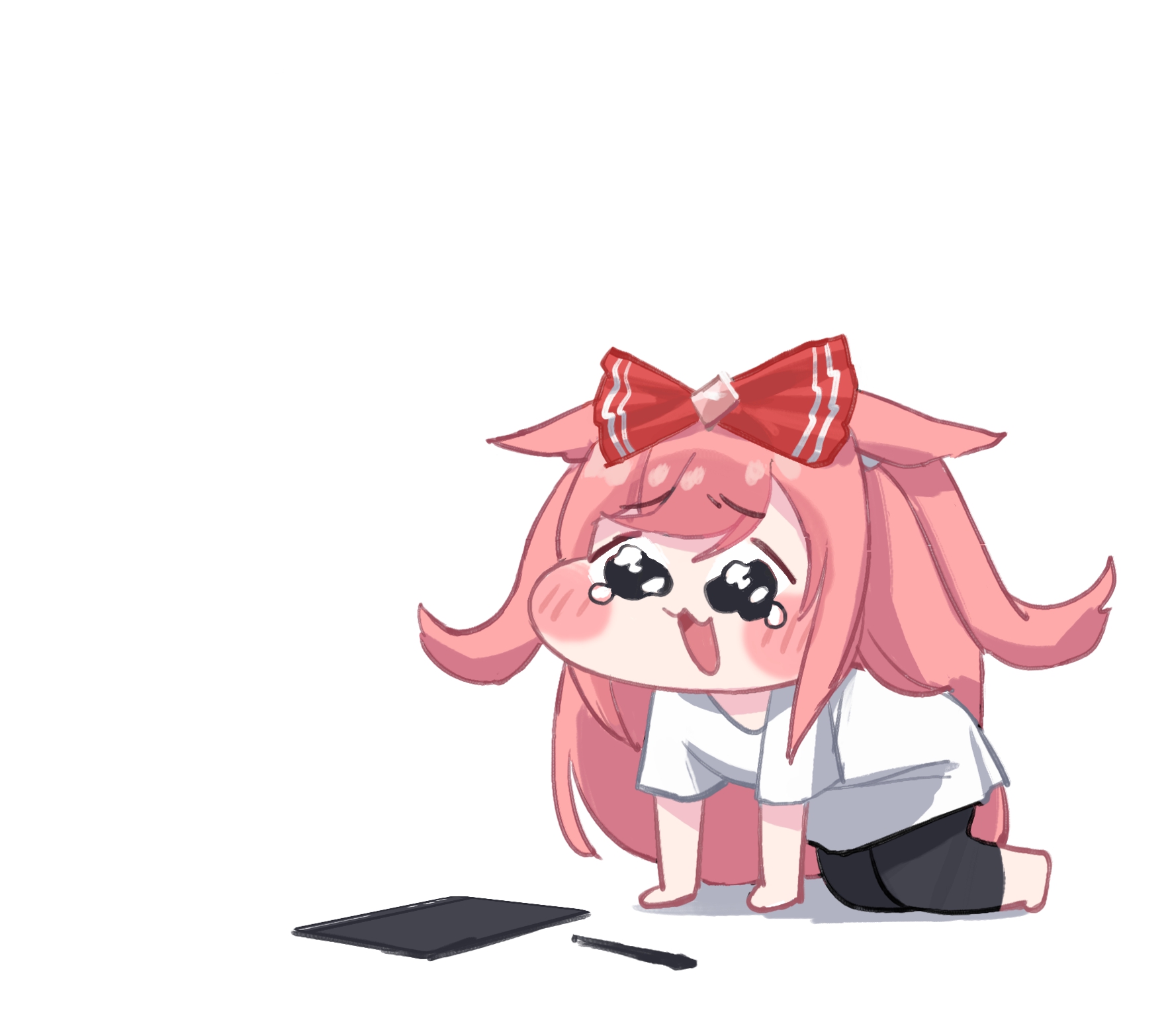 1girl agnes_digital_(umamusume) all_fours alternate_costume animal_ears black_pants bow commentary_request crying crying_with_eyes_open drawing_tablet full_body hair_bow highres horse_ears horse_girl long_hair meme open_mouth pants pen pink_hair pleading_eyes red_bow shihayashi shirt simple_background solo speakiposting_(meme) t-shirt tearing_up tears umamusume wavy_eyes white_background white_shirt