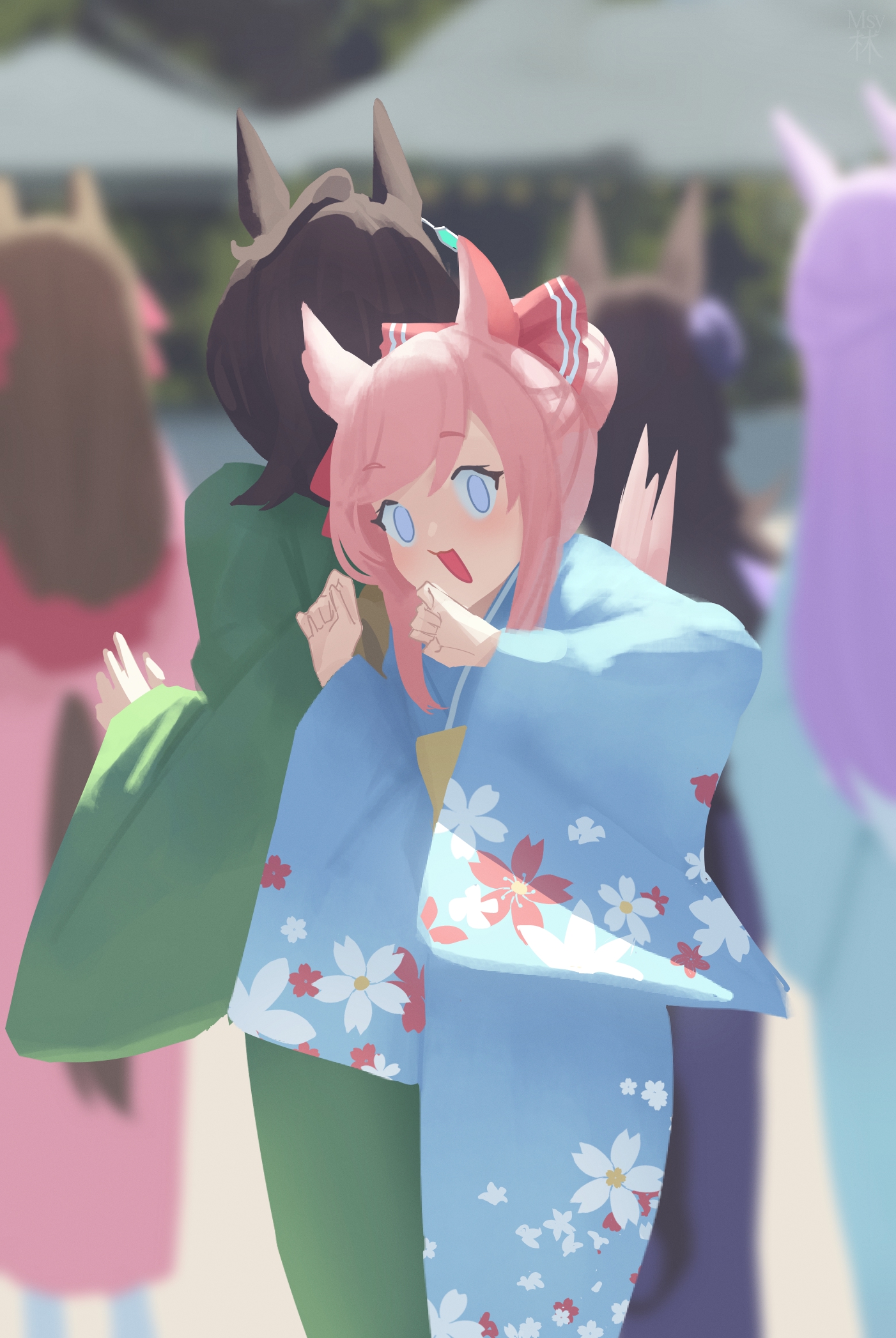 5girls agnes_digital_(umamusume) agnes_tachyon_(umamusume) ahoge alternate_costume alternate_hairstyle blue_eyes blue_kimono bow brown_hair clothing_cutout commentary_request floral_print furisode green_kimono hair_bow hair_bun hair_down highres horse_girl japanese_clothes kimono mejiro_mcqueen_(umamusume) multiple_girls new_year pink_kimono purple_hair purple_kimono red_bow rice_shower_(umamusume) shihayashi single_hair_bun smart_falcon_(umamusume) solo_focus surprised swept_bangs tail tail_through_clothes umamusume wide_sleeves