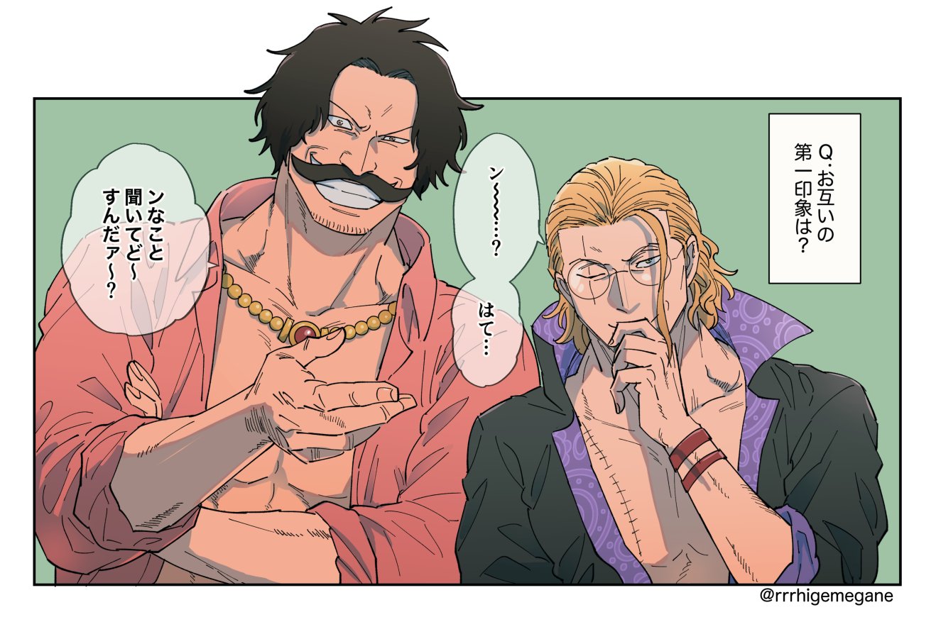 2boys black_hair blonde_hair bracelet collared_shirt commentary_request facial_hair glasses gol_d._roger grin handlebar_mustache jewelry looking_at_viewer male_focus multiple_boys mustache one_piece pink_shirt popped_collar rrrhigemegane scar scar_across_eye scar_on_face shirt silvers_rayleigh smile speech_bubble stitched_torso stitches thinking translation_request