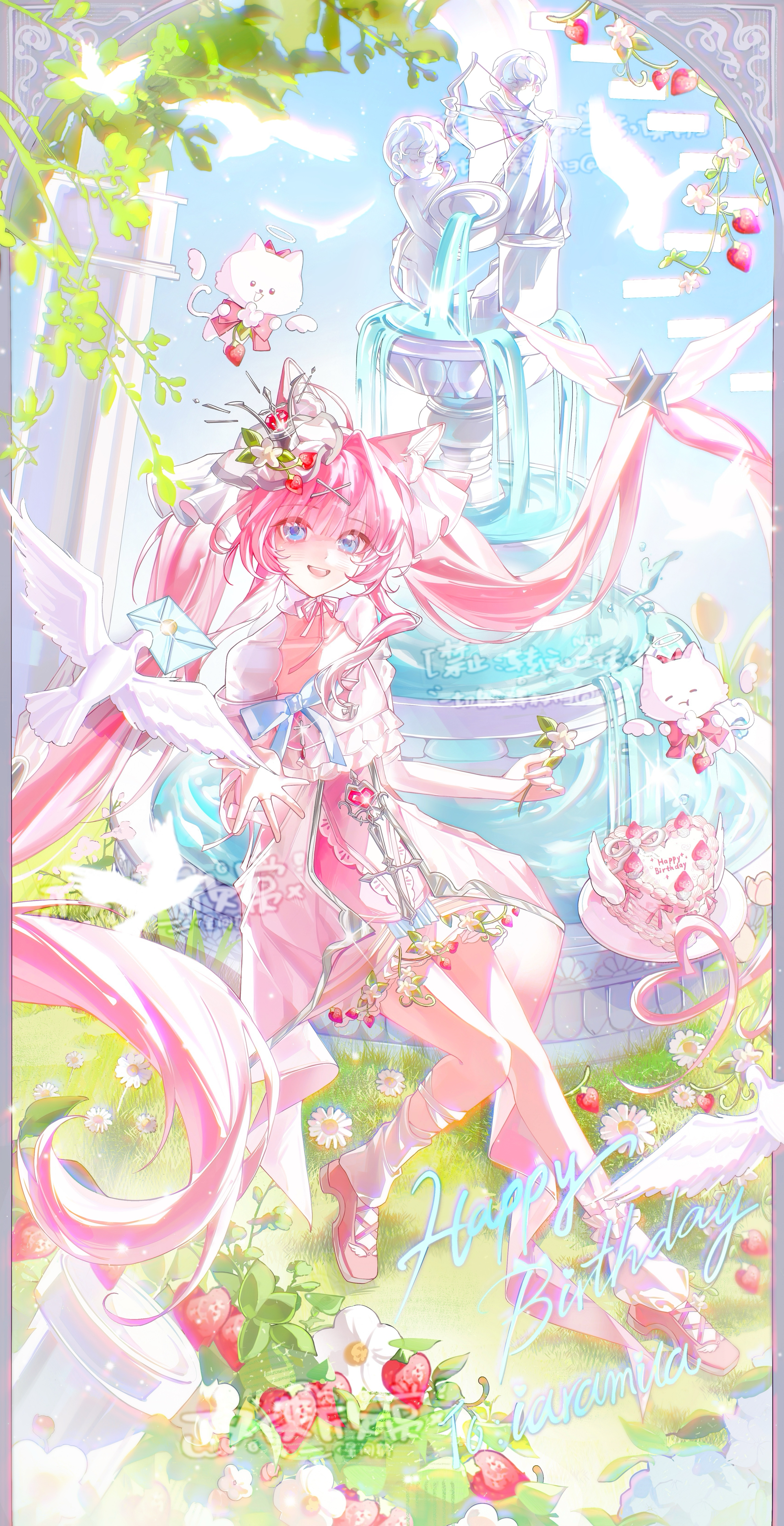 1girl absurdres animal_ears bird blue_eyes dove dress flower food fruit full_body hair_flower hair_ornament highres holding long_hair looking_at_viewer open_mouth original pillar pink_hair sky smile solo strawberry twintails very_long_hair white_bird white_dress white_flower xing_jian_he