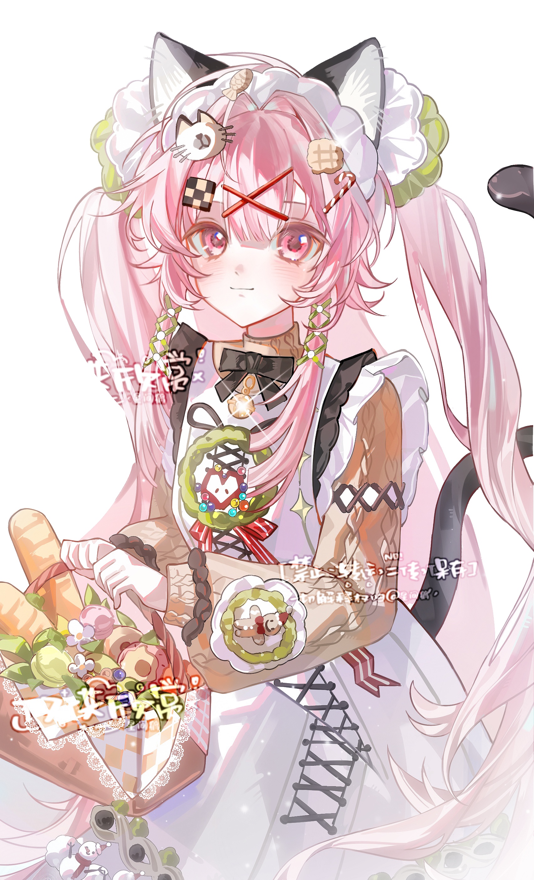 1girl absurdres animal_ear_fluff animal_ears apron baguette basket bell black_bow black_bowtie blush bow bowtie bread brown_sweater cat_ears cat_girl cat_tail chinese_text closed_mouth cowboy_shot cross-laced_clothes cross-laced_dress cross-laced_sleeves dress food food-themed_hair_ornament frilled_sleeves frills fruit hair_ornament hairclip highres holding holding_basket long_hair long_sleeves looking_at_viewer maid_headdress neck_bell original pink_eyes pink_hair puffy_long_sleeves puffy_sleeves sample_watermark sidelocks simple_background smile solo sweater tail twintails very_long_hair watermark white_apron white_background white_dress x_hair_ornament xing_jian_he