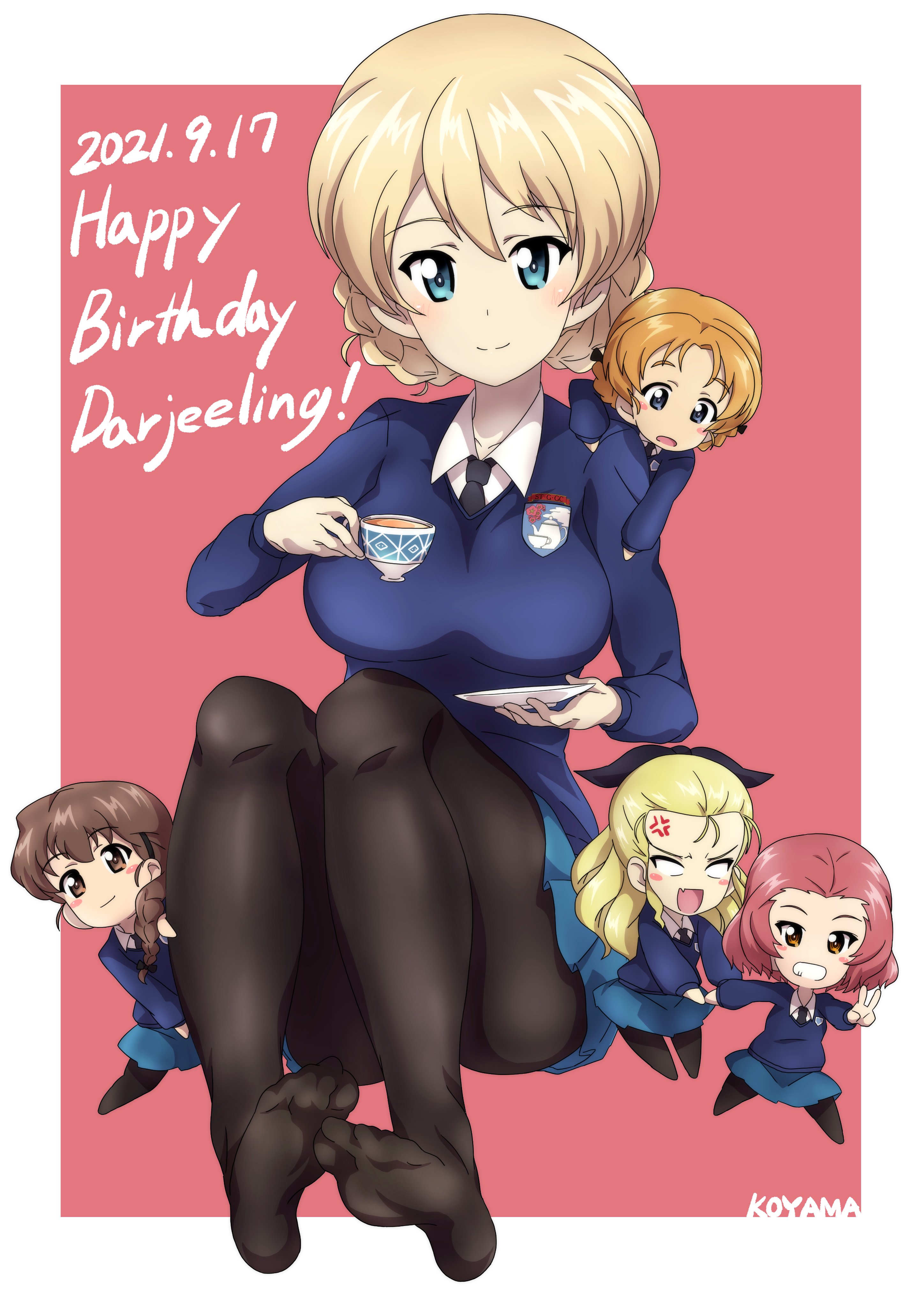 2021 5girls 9s0ykoyama117 absurdres anger_vein assam_(girls_und_panzer) black_pantyhose breasts collared_shirt commentary_request cup darjeeling_(girls_und_panzer) dated girls_und_panzer happy_birthday highres holding holding_cup holding_plate looking_at_viewer medium_breasts multiple_girls orange_pekoe_(girls_und_panzer) pantyhose plate rosehip_(girls_und_panzer) rukuriri_(girls_und_panzer) school_uniform shirt solo_focus st._gloriana's_school_uniform teacup white_background