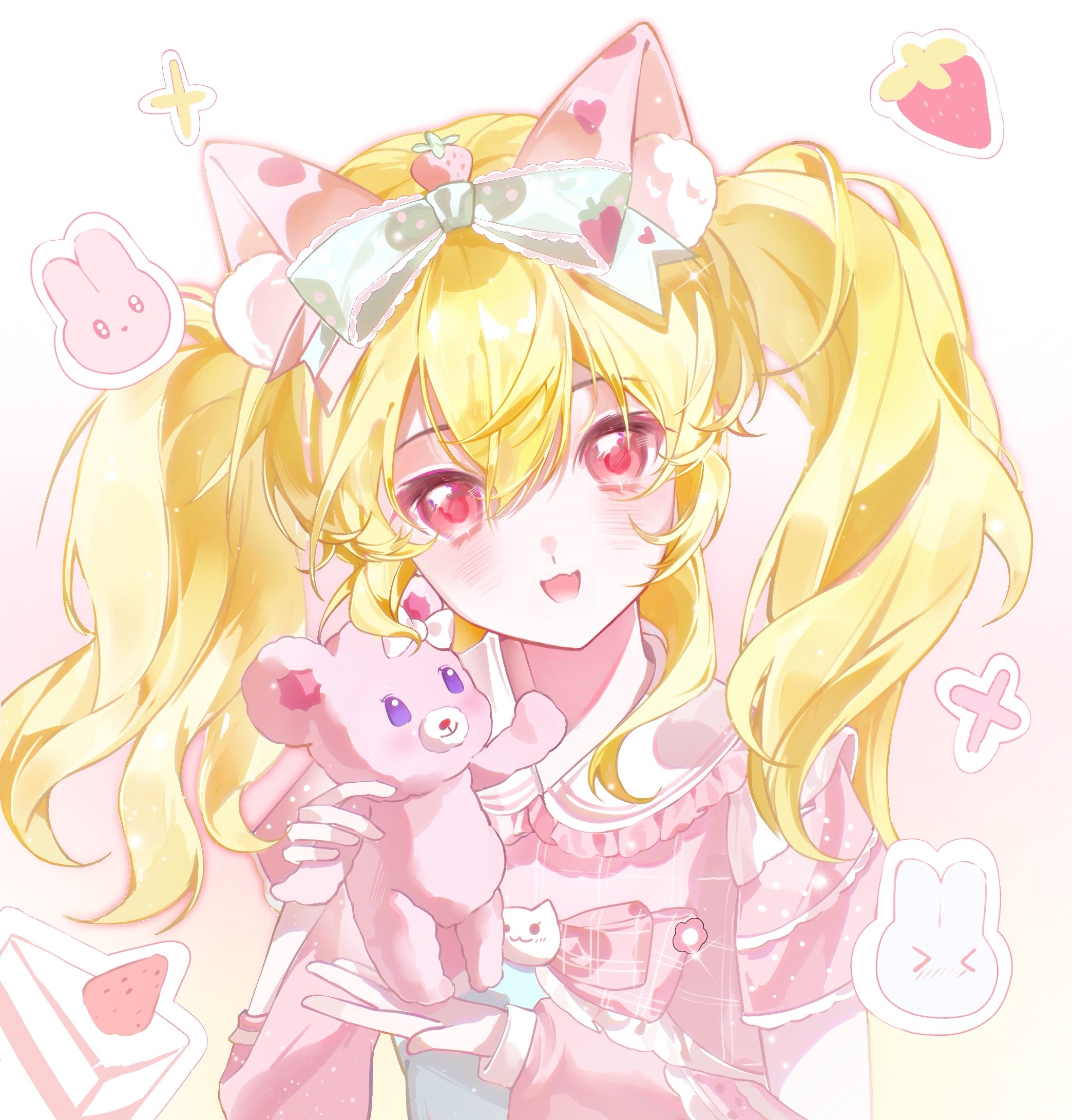 1girl :d aikatsu!_(series) animal_ears blonde_hair blush bow cake cake_slice cat_ears chinese_commentary commentary_request food frills fruit hair_between_eyes hair_bow hair_ornament highres holding holding_stuffed_toy hoshimiya_ichigo long_hair long_sleeves looking_at_viewer open_mouth pink_bow pink_shirt red_eyes shirt smile solo sparkle strawberry stuffed_animal stuffed_rabbit stuffed_toy teddy_bear twintails upper_body xing_jian_he