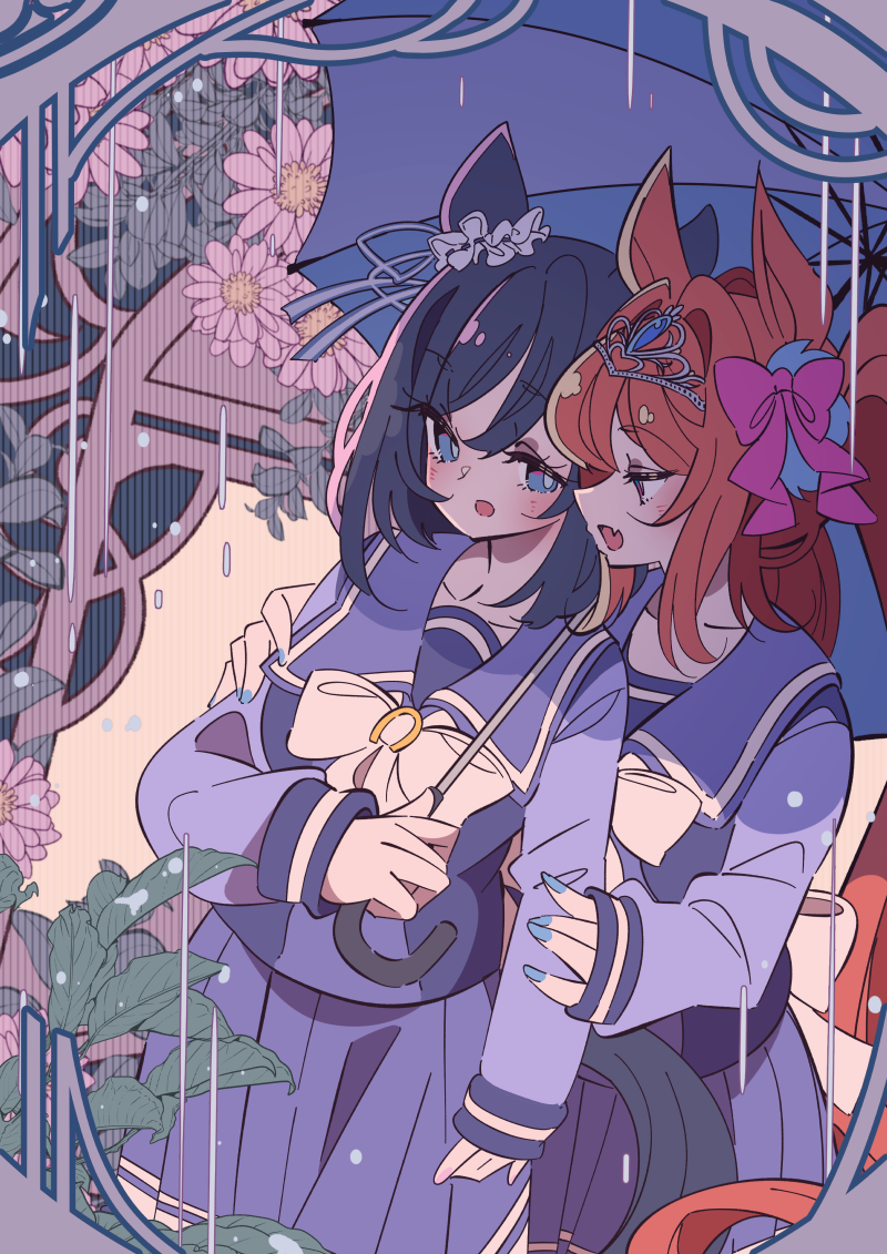 2girls animal_ears black_hair blue_eyes blue_nails blue_skirt blush bow commentary_request daiwa_scarlet_(umamusume) ear_ribbon eishin_flash_(umamusume) fingernails holding holding_umbrella honkawa_works horse_ears horse_tail long_hair long_sleeves multiple_girls nail_polish open_mouth rain red_hair school_uniform short_hair skirt tail tiara tracen_school_uniform twintails umamusume umbrella yuri
