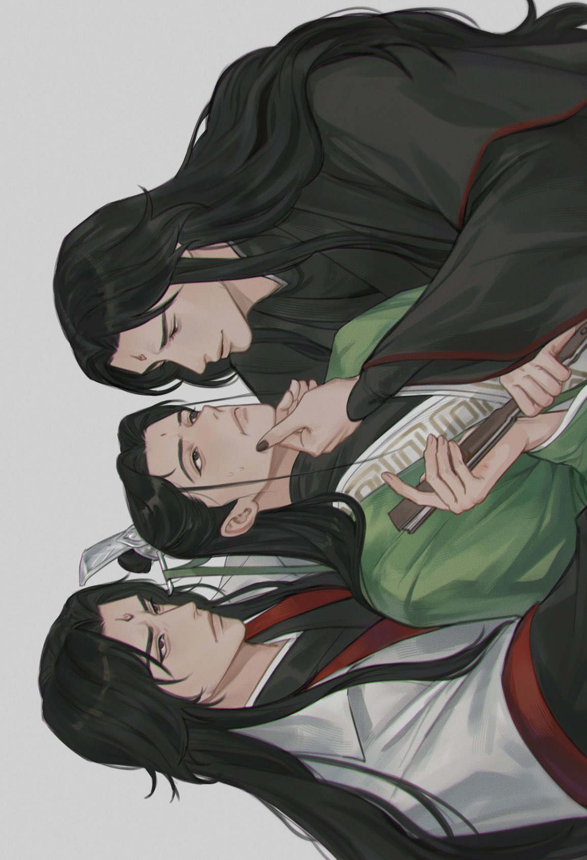 3boys :i angry bindi black_eyes black_hair black_hanfu black_nails chinese_clothes clone_harem closed_mouth coat collared_coat commentary_request curtained_hair dark_persona folded_fan folding_fan furrowed_brow grabbing_another's_chin green_hanfu grey_background half-closed_eyes half_updo hand_fan hand_on_another's_chin hanfu highres holding holding_fan korean_commentary layered_sleeves long_hair long_sleeves looking_at_another luo_binghe male_focus multiple_boys omyo_0 parted_bangs red_eyes renzha_fanpai_zijiu_xitong ribboned_xiao_guan shen_qingqiu sidelocks sideways simple_background sweatdrop v-shaped_eyebrows white_coat wide_sleeves wolf_cut yaoi zuiyin