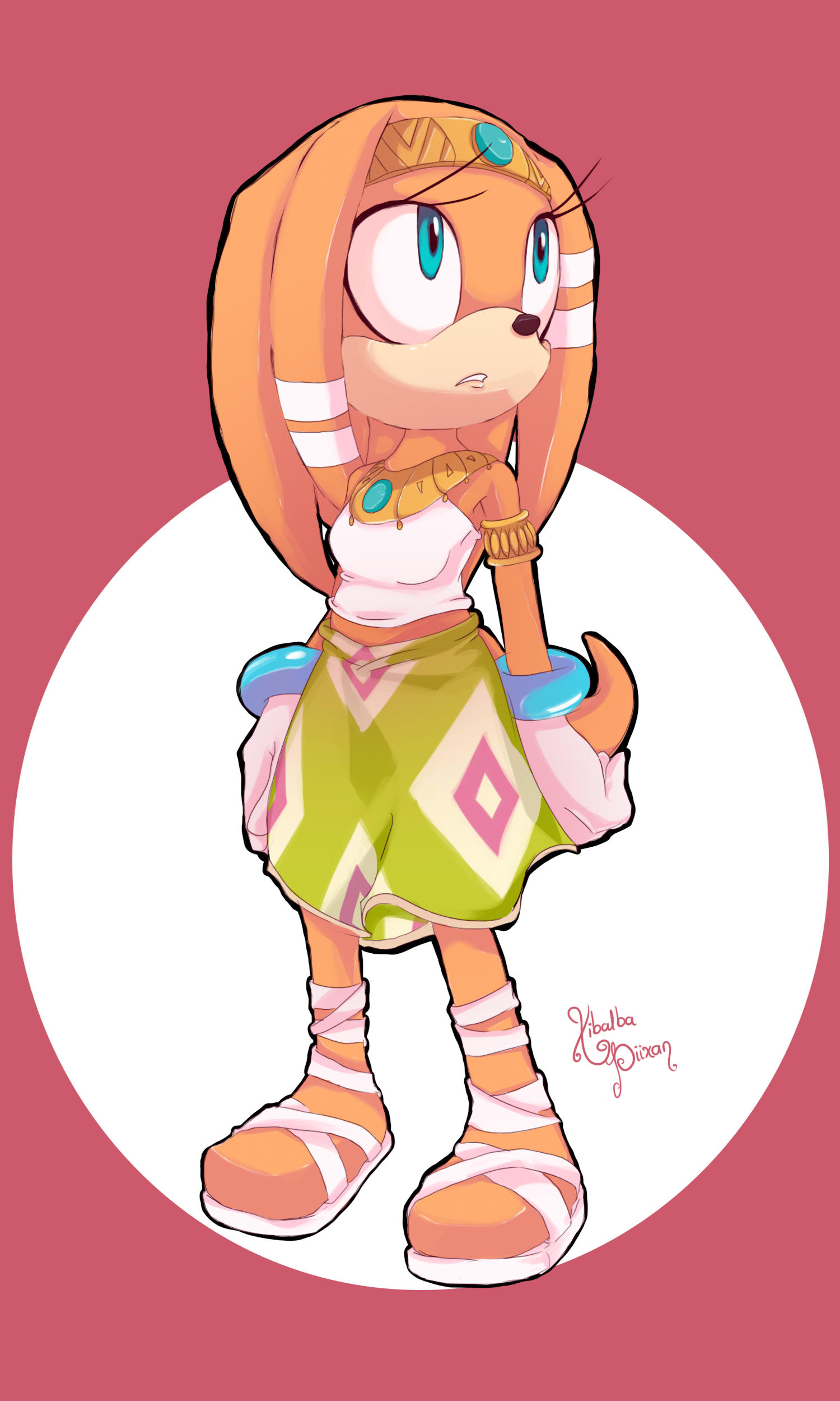 1girl absurdres artist_name blue_eyes bracelet commentary cross-laced_sandals english_commentary furry furry_female gloves green_skirt highres jewelry looking_up orange_fur parted_lips red_background sandals signature skirt solo sonic_(series) sonic_adventure strapless tikal_the_echidna tube_top two-tone_background white_background white_gloves white_tube_top xibalba
