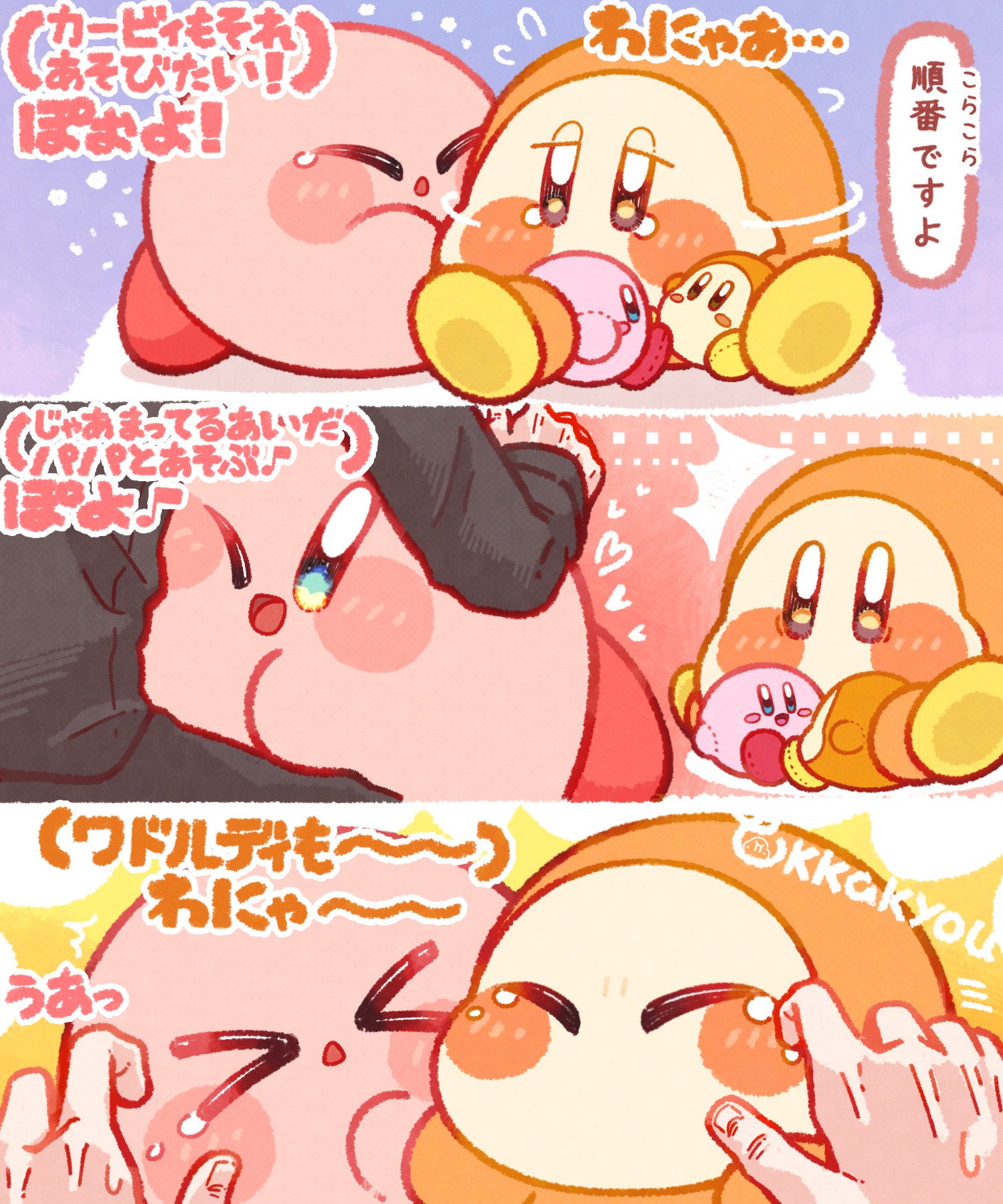 >_< 1boy ;d ^^^ blue_eyes blush_stickers brown_eyes character_doll closed_eyes commentary_request doll flying_sweatdrops heart highres hug kirby kirby_(series) nintendo one_eye_closed open_mouth real_life sakurai_masahiro smile tears tokkakyou translation_request waddle_dee