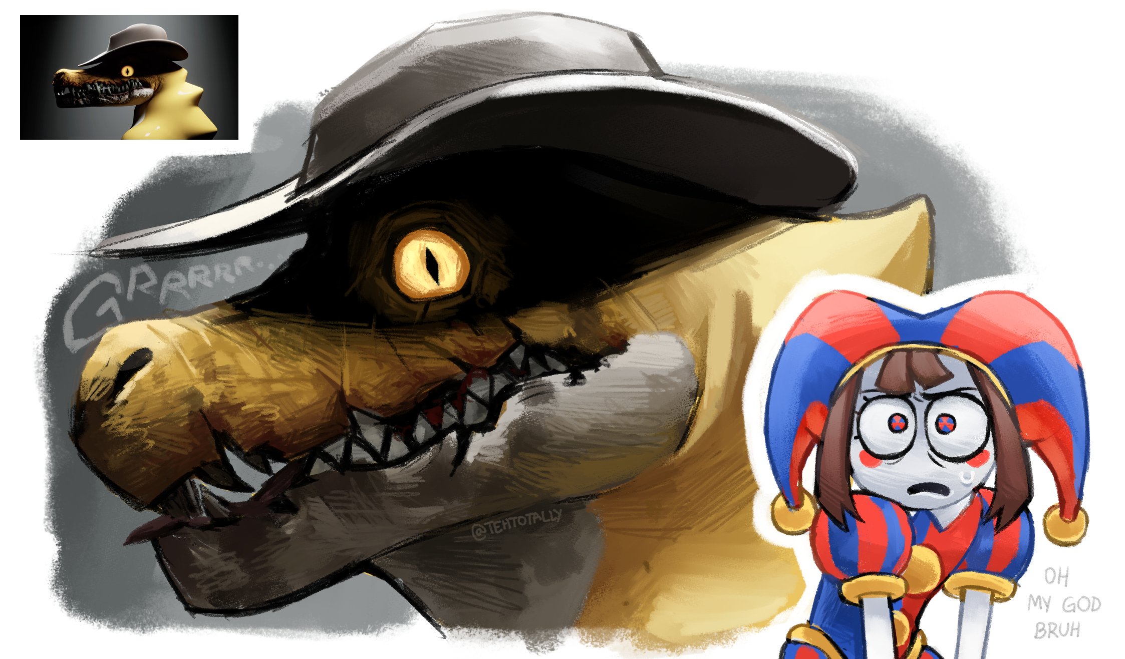 1boy 1girl brown_hair commentary cowboy_hat crocodile_boy english_commentary english_text fangs glowing glowing_eyes gummigoo hat highres jester_cap looking_at_viewer looking_to_the_side open_mouth pomni_(the_amazing_digital_circus) screenshot_inset sweatdrop tehtotally the_amazing_digital_circus