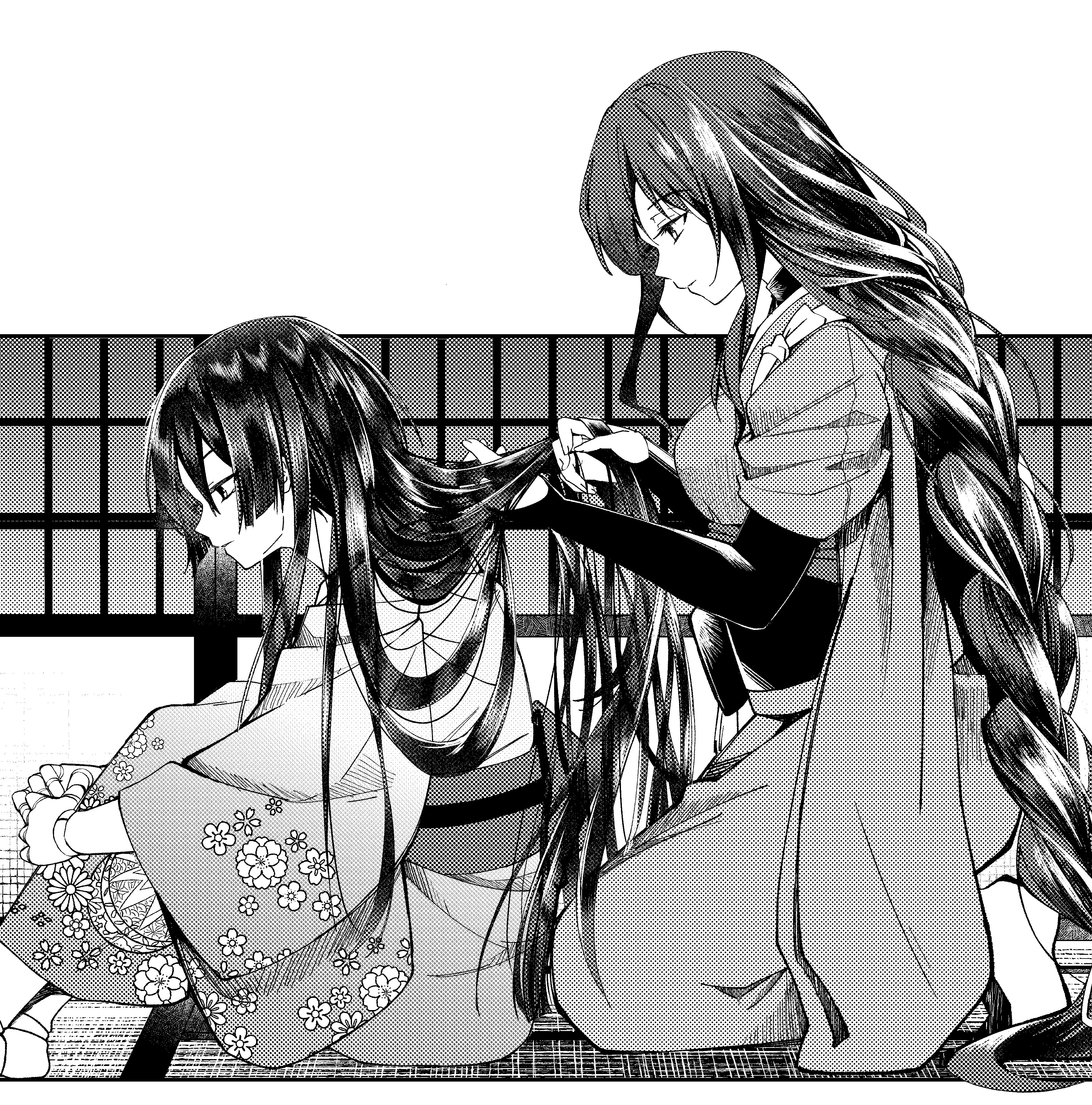 1boy 1girl absurdres alternate_costume alternate_hair_length alternate_hairstyle alternate_universe barefoot blunt_ends braid bridal_gauntlets closed_mouth commentary_request doll_joints eyelashes fingernails floral_print floral_print_kimono floral_print_sleeves furisode genshin_impact greyscale hair_tie half-closed_eyes hand_in_another's_hair hands_up highres indoors iwoarazumi129 japanese_clothes joints kimono knees_up long_hair long_sleeves looking_at_another looking_down low-braided_long_hair low-tied_long_hair lying monochrome mother_and_child mother_and_son obi on_side parent_and_child print_kimono profile raiden_shogun sash scaramouche_(genshin_impact) scaramouche_(kabukimono)_(genshin_impact) seiza short_sleeves shouji sidelocks sitting sleeves_rolled_up sliding_doors stirrup_legwear tasuki toeless_legwear tsurime very_long_hair wide_sleeves