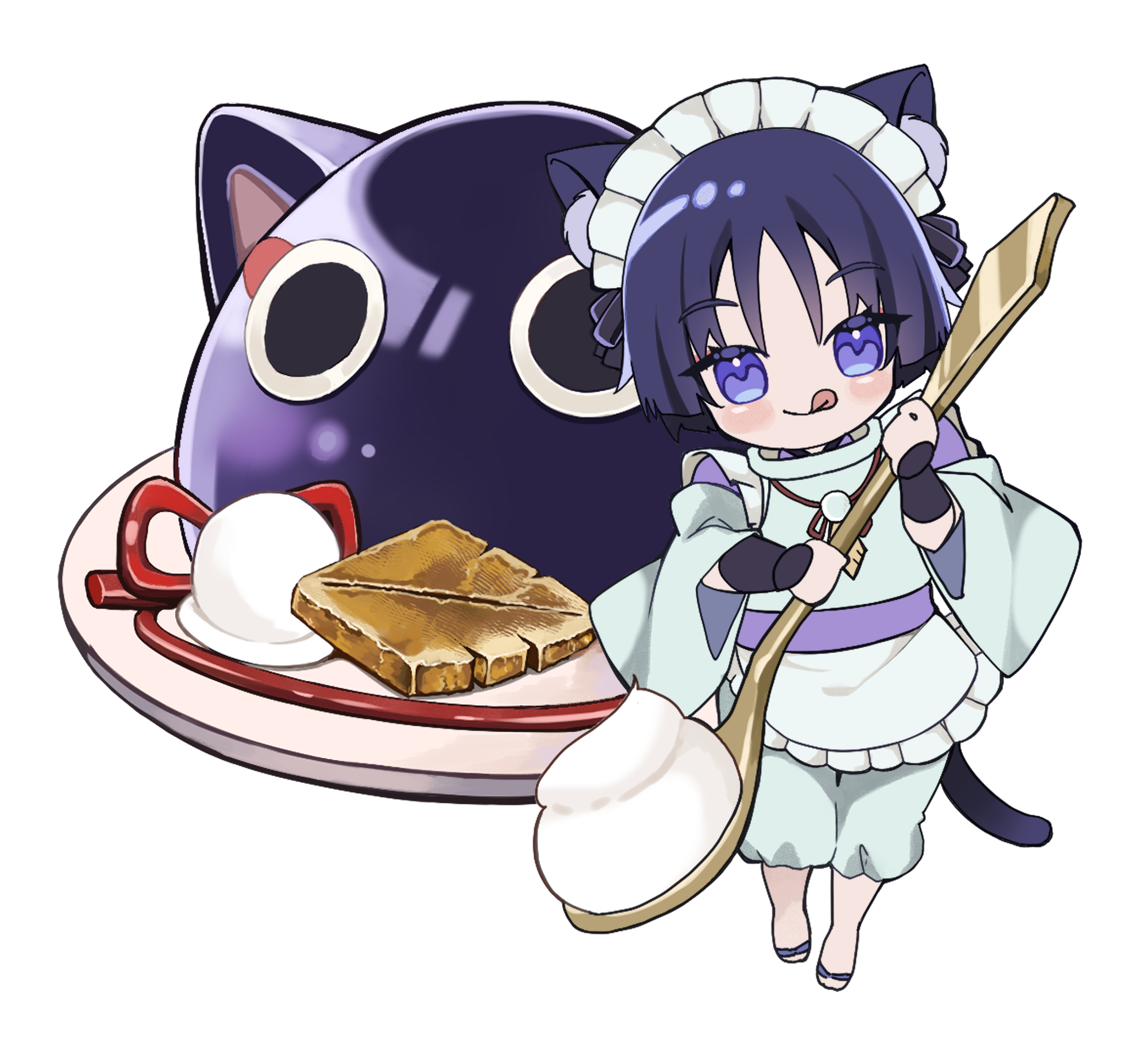 1boy :d alternate_costume animal-themed_food animal_ears apron armor biscuit_(bread) blunt_ends cat cat_boy cat_ears cat_tail choppy_bangs clenched_hands clothing_cutout commentary_request cream crossdressing crossdressing_(mtf) enmaided eyelashes eyeliner frilled_apron frills full_body genshin_impact hands_up highres holding holding_spoon iwoarazumi129 japanese_armor japanese_clothes kimono kote kurokote layered_sleeves looking_at_viewer maid maid_headdress makeup male_focus male_maid open_mouth pants purple_cat purple_eyes purple_kimono purple_sleeves red_eyeliner sandals scaramouche_(cat)_(genshin_impact) scaramouche_(genshin_impact) scaramouche_(kabukimono)_(genshin_impact) shoulder_cutout smile solo spoon string tail wa_maid waist_apron white_background white_pants white_sleeves
