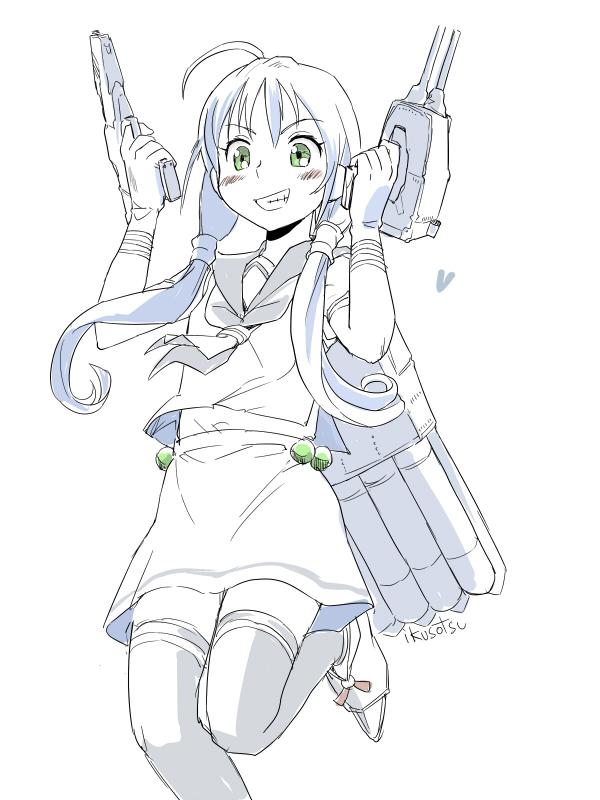 1girl ahoge artist_name blue_hair commentary_request dual_wielding green_eyes grin gun holding holding_gun holding_weapon ikusotsu kantai_collection long_hair low_twintails miniskirt rigging samidare_(kancolle) school_uniform serafuku signature skirt smile solo spot_color standing standing_on_one_leg thighhighs twintails weapon zettai_ryouiki