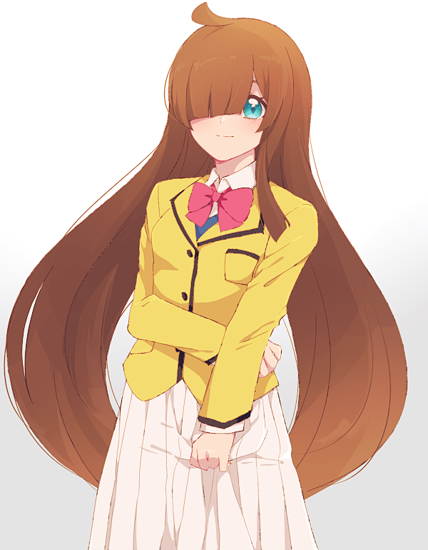 1girl ahoge akasata blazer blue_eyes blunt_bangs bow bowtie brown_hair closed_mouth collared_shirt commentary_request cowboy_shot hair_over_one_eye jacket kirarigaoka_middle_school_uniform kiratto_pri_chan long_hair long_sleeves looking_at_viewer nijinosaki_dia pink_bow pink_bowtie pleated_skirt pretty_series school_uniform shirt sidelocks skirt smile solo standing white_shirt white_skirt yellow_jacket