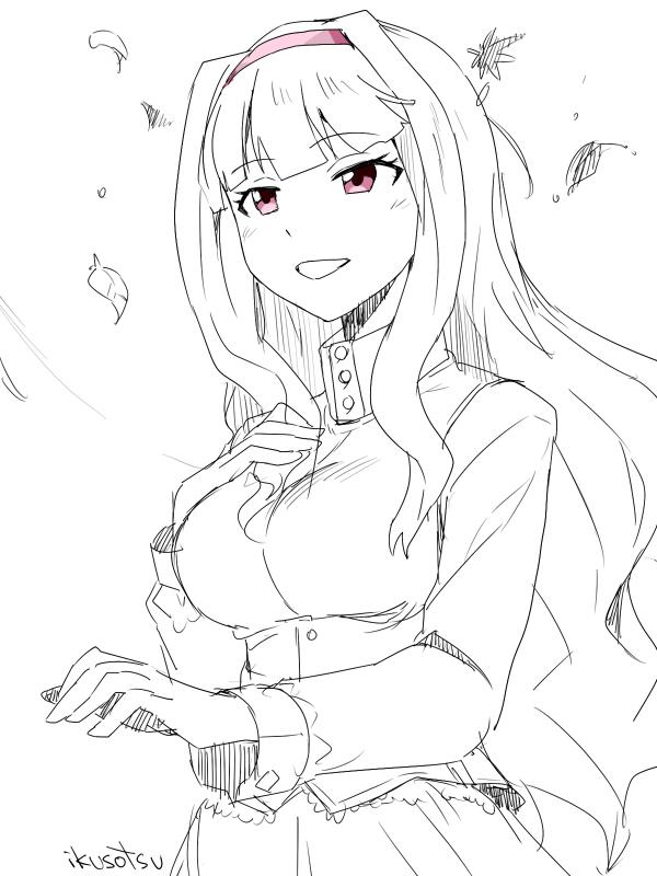1girl artist_name breasts commentary_request idolmaster idolmaster_(classic) ikusotsu large_breasts leaf long_hair monochrome open_mouth pink_eyes pink_hair shijou_takane signature skirt smile solo spot_color upper_body