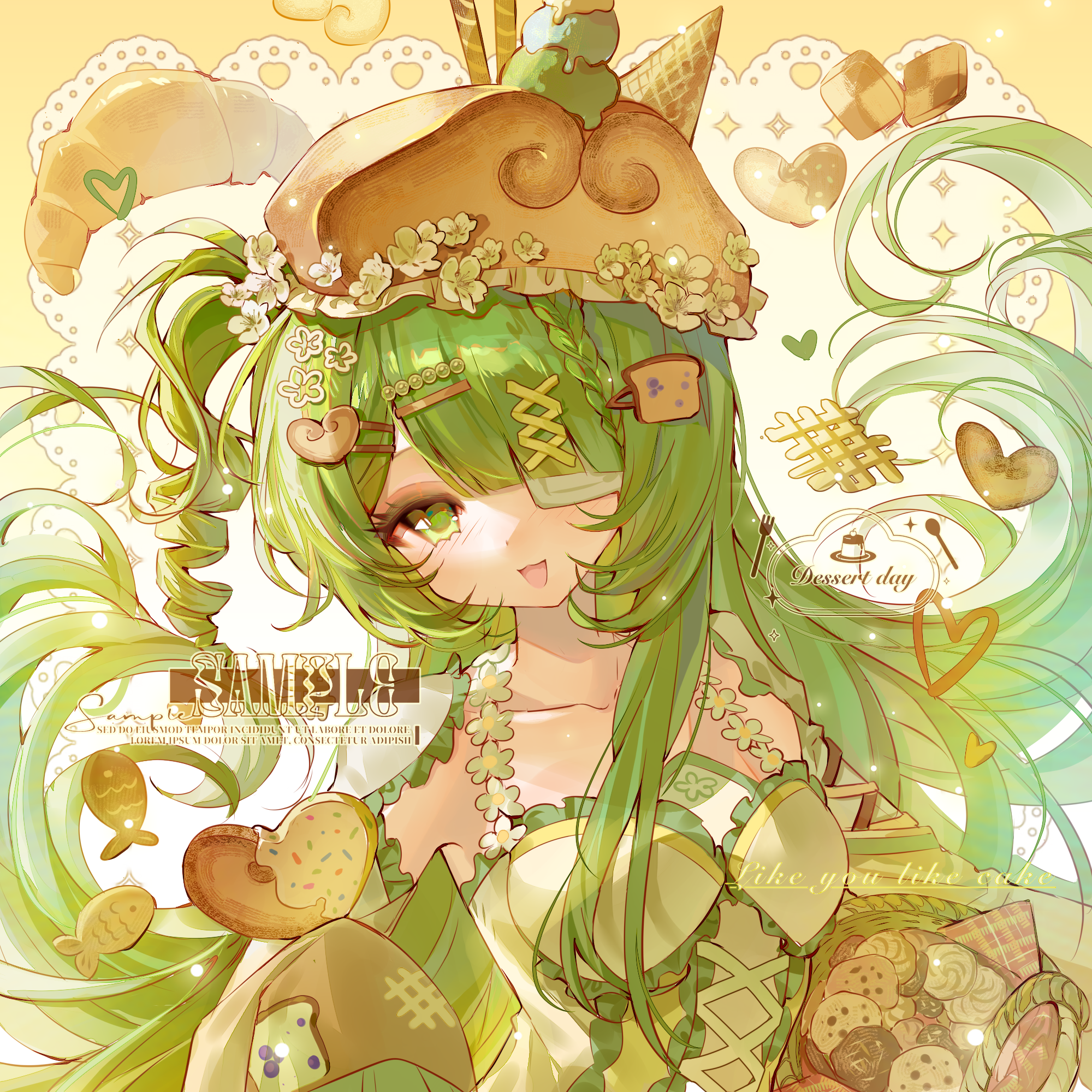 1girl artist_name braid bread breasts collarbone cookie detached_sleeves dress english_text eyepatch flower food frills green_eyes green_hair hair_flower hair_ornament hairclip heart highres ice_cream ice_cream_cone long_hair long_sleeves looking_at_viewer n1xiangsondao open_mouth original sleeves_past_wrists smile solo upper_body very_long_hair watermark