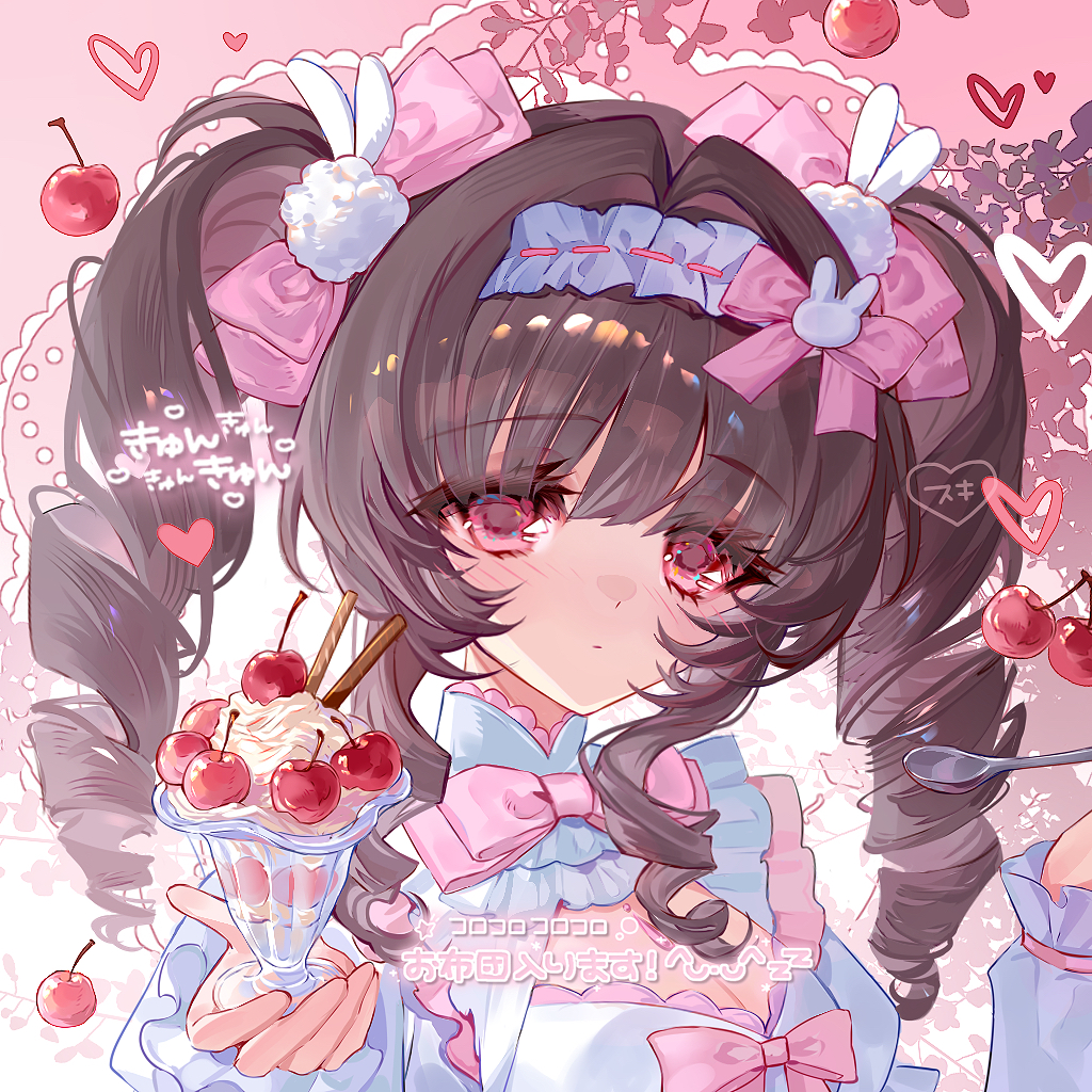 1girl blush bow bowtie breasts brown_hair cherry cleavage cleavage_cutout closed_mouth clothing_cutout dress drill_hair food frilled_hairband frills fruit hair_bow hair_intakes hair_ornament hairband heart holding holding_spoon ice_cream lolita_hairband long_hair long_sleeves looking_at_viewer n1xiangsondao original parfait pink_background pink_bow pink_bowtie pink_eyes portrait puffy_sleeves rabbit_hair_ornament shirt solo spoon twin_drills twintails upper_body