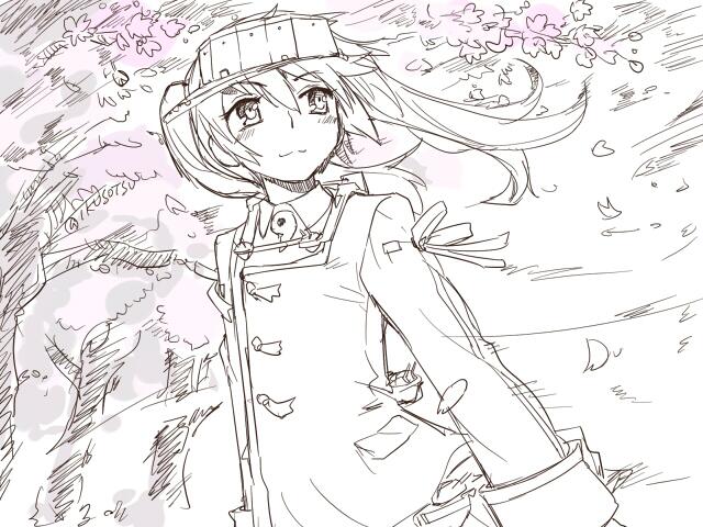 1girl cherry_blossoms commentary_request greyscale ikusotsu japanese_clothes kantai_collection kariginu looking_to_the_side magatama monochrome petals ribbon-trimmed_sleeves ribbon_trim ryuujou_(kancolle) solo spot_color tree twintails upper_body visor_cap wind