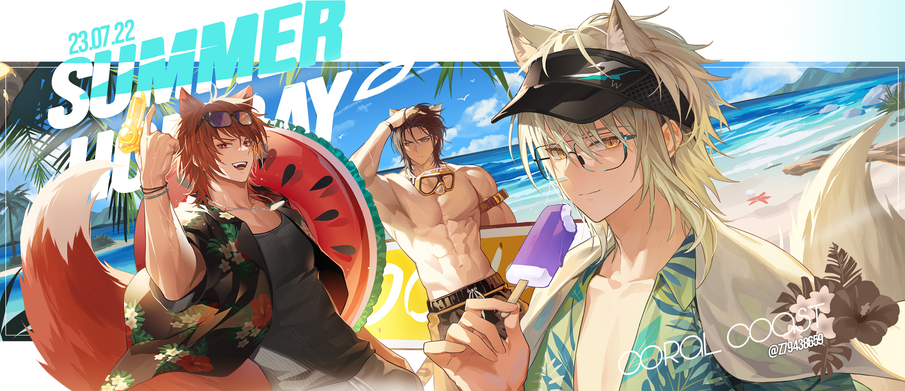3boys animal_ears aosta_(arknights) arknights artist_name beach broca_(arknights) chiave_(arknights) cloud eyewear_on_head food fox_ears fox_tail glasses hawaiian_shirt highres innertube male_focus multiple_boys muscular ocean open_clothes palm_tree popsicle seaside shirt sky slit_pupils snorkel summer surfboard swim_ring tail tiger_boy tiger_ears tiger_tail topless_male tree upper_body visor_cap wolf_ears wolf_tail yellow_eyes zerg_(z79438659)