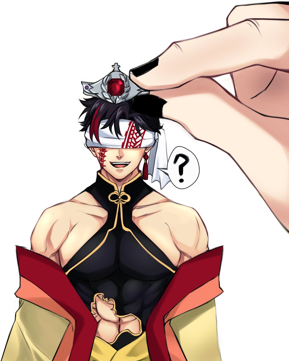 1boy ? back_cutout bare_shoulders black_hair blindfold bodysuit centipede_tattoo chinese_clothes chinese_knot clothing_cutout detached_sleeves earrings facial_tattoo giant_hand highres jewelry large_pectorals male_focus mandarin_collar manly miha_chiii multicolored_hair muscular muscular_male navel_cutout open_mouth pectorals pov pov_hands qin_shi_huang_(shuumatsu_no_valkyrie) red_hair red_tattoo ring short_hair shuumatsu_no_valkyrie simple_background single_earring sleeveless sleeveless_bodysuit sleeveless_turtleneck spiked_hair tassel tassel_earrings tattoo teeth turtleneck turtleneck_bodysuit two-tone_hair white_background